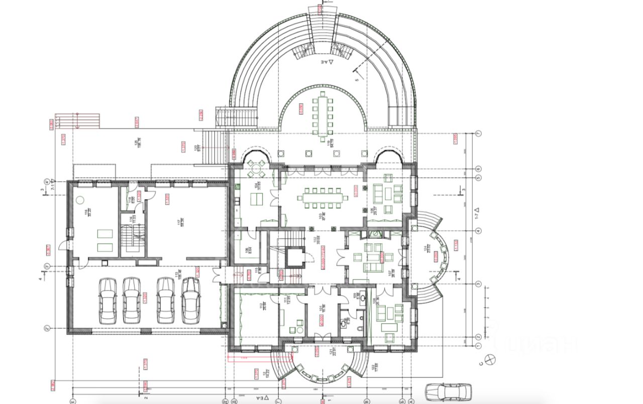 К дому примыкает гараж на 5 м/м. Над гаражом расположены квартиры для персонала (4 спальни с санузлами, кухня, гостиная)