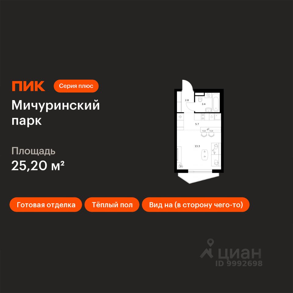 Продаётся квартира-студия площадью 25,2 кв.м на 23 этаже 24 этажного дома (Корпус 4.2, Секция 1) проекта ПИК Мичуринский парк. Светлый просторный подъезд на уровне земли, функциональная планировка, большие окна, c отделкой.