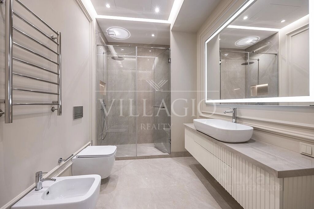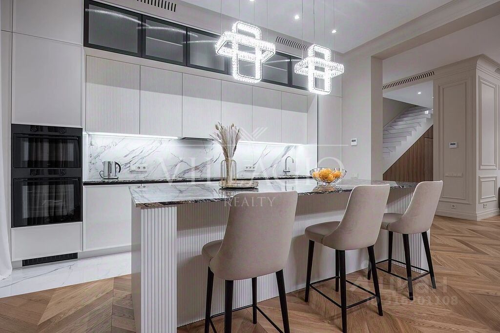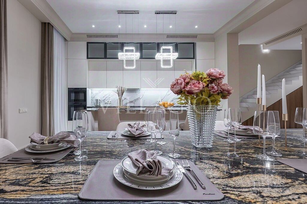 При отделке таунхауса использовались исключительно премиальные материалы: кухня укомплектована техникой ASKO, в санузлах установлена итальянская сантехника. На всех керамогранитных поверхностях установлен подогрев полов. По всему дому проведено канальное кондиционирование. Система очистки воды до питьевой делает жизнь ещё комфортнее. Дом полностью готов к проживанию и продается с мебелью, представленной на фото. В доме никто не жил после ремонта.