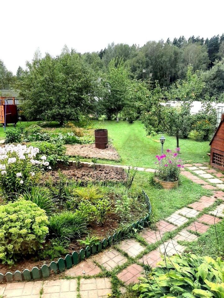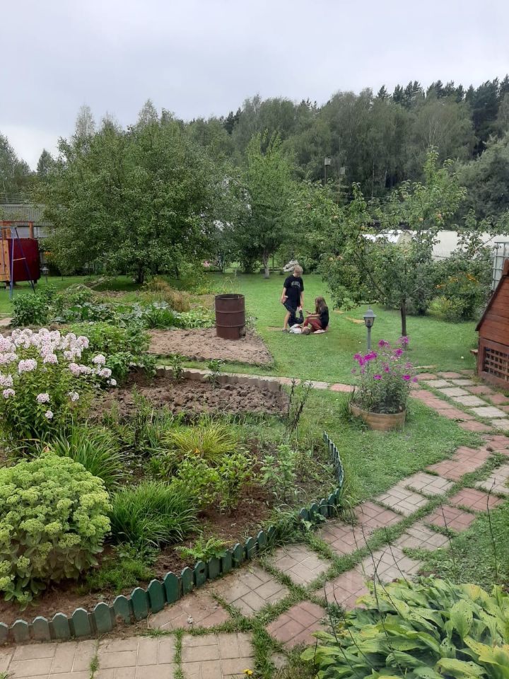 На участке высажено много плодовых деревьев, кустарников и цветов.