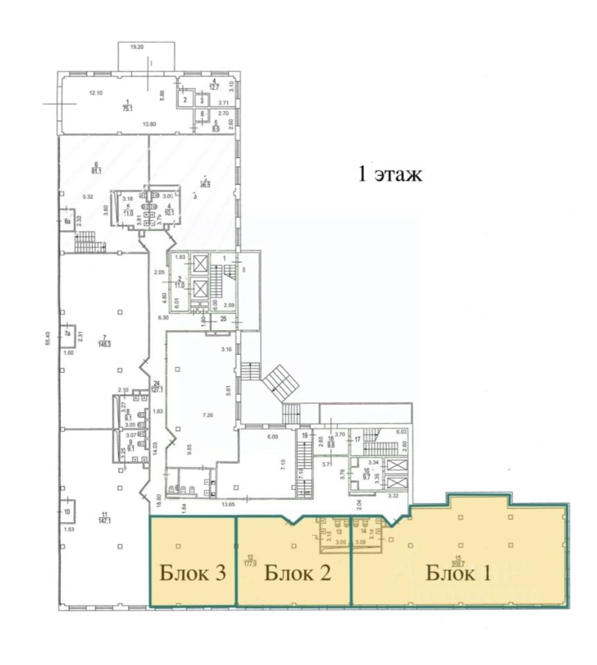 Предлагаемые площади от 85 до 1442 метров. Санузлы в блоках.