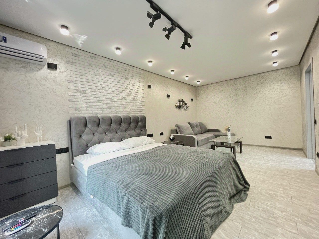 Две двуспальные кровати с подсветкой, реагирующей на движение, диван, журанльный стол, настенное пано, комод, искуственные растения, прикроватные тумбы, прихожий гарнитур, кухонный гарнитур, кухонный стол и стулья, два кондиционера, два телевизора, стиральная машина, посудомоечная машина, варочная панель, встроенная микроволновая печь, холодильник, декор, подсветка по периметру обеих комнат во всех цветах радуги.