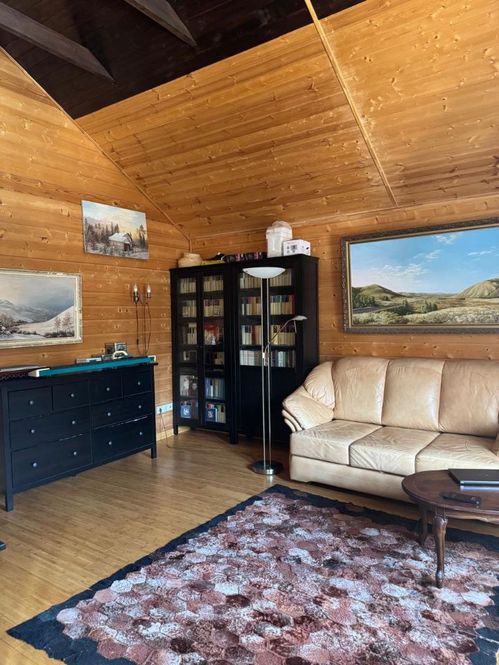Дом: 2 этажа, использованы качественные экологически чистые и долговечные материалы: архангельский брус, ЦСП, крыша металлочерепица Ranilla. В доме установлены качественные деревянные окна со стеклопакетами фирмы Баварские окна, выполнено утепление по всему периметру, дом очень теплый, дышит. На 1-ом этаже прихожая со встроенными шкафами, гостевая спальня, просторная столовая, гостиная с камином, есть печь, два санузла, кухня с выходом на просторную террасу с видом на лесную опушку, котельная. Выход в гараж. На 2-ом этаже 2 изолированные спальни, библиотека большой площадью (есть возможность сделать третью спальню, санузел, изолированная комната 7,5х3,5 (не используется, можно использовать при необходимости как четвертую спальню, гардеробную или комнату свободного назначения).