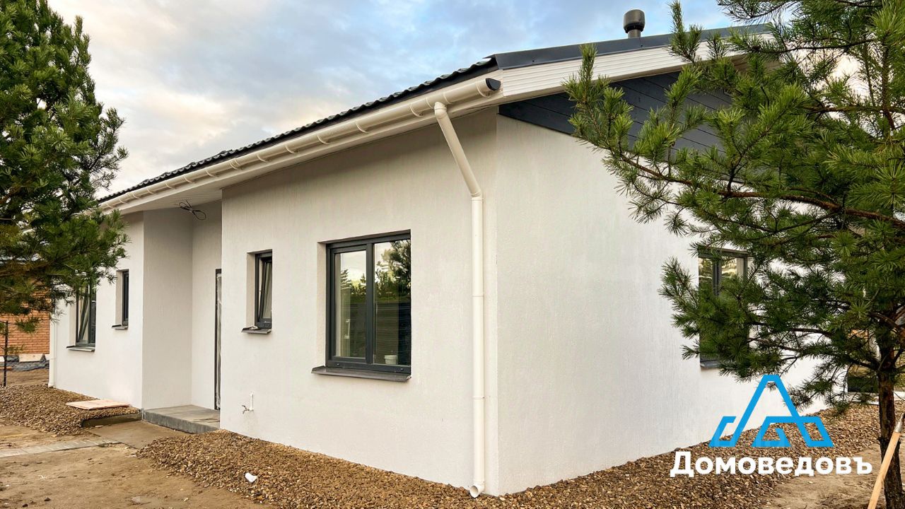 - Фундамент утепленная шведская плита (УШП). - Крыша металлочерепица, снегозадержатель, водоотведение с кровли. - Стены внутри: штукатурка, стеклохолст, шпатлевка, краска/обои/керамогранит в санузле, снаружи: цементная штукатурка, стеклотканевая сетка, декоративное покрытие ''Короед'', фасадная краска. - Пол керамогранит в прихожей, коридоре, санузле и кухне-гостиной, ламинат в комнатах. - Потолок натяжной, матовый. - Металлическая входная дверь с терморазрывом, деревянные межкомнатные двери, двухкамерные стеклопакеты поворотно-откидные.
