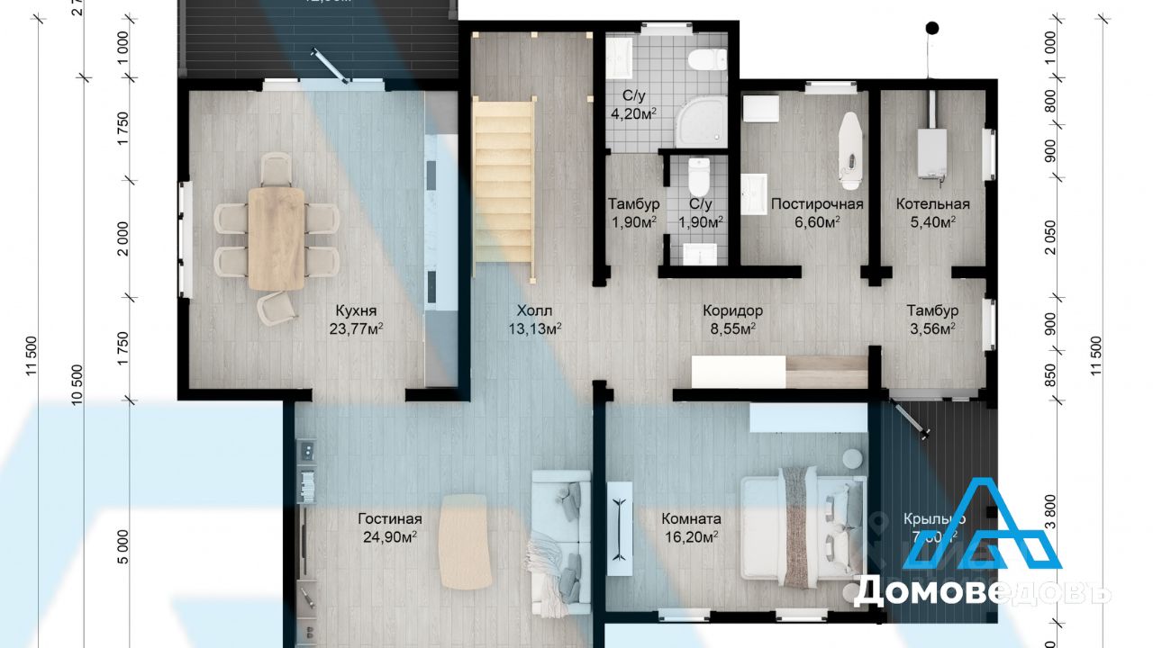 На 1 этаже терраса площадью 13 кв. м, кухня 24 кв. м, гостиная 25 кв. м, комната 16 кв. м, два санузла 2 кв. м и 4 кв. м, тамбур 2 кв. м, постирочная 7 кв. м, техническое помещение 5 кв. м, холл 13 кв. м, коридор 9 кв. м, тамбур 4 кв. м и крыльцо 8 кв. м.
