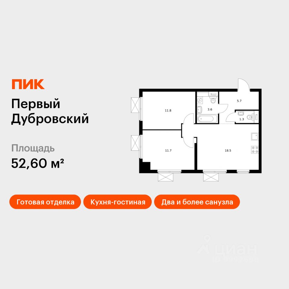 Продаётся 2-комн. квартира площадью 52,6 кв.м на 27 этаже 28 этажного дома (Корпус 1.2, Секция 2) проекта ПИК Первый Дубровский. Светлый просторный подъезд на уровне земли, функциональная планировка, большие окна, c отделкой.