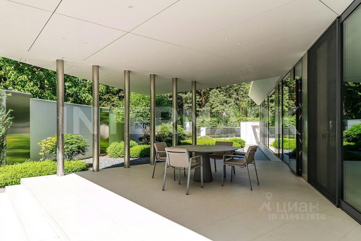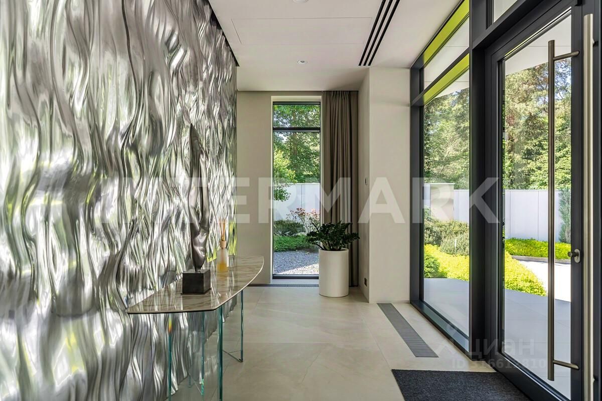В доме есть все для комфортной жизни: гостиная с двусторонним паровым камином и панорамными окнами, кухня-столовая с выходом на террасу, 4 спальни, кабинет и спа-зона с сауной, хаммамом, джакузи и купелью.