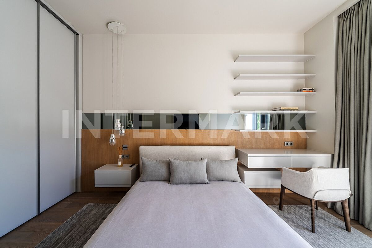 В дизайне интерьера использованы натуральные материалы: мрамор Fior Di Bosco, белый кварцит, орех, дуб, термоясень и фиброцементные панели. Их гармоничное сочетание обеспечивает высокое качество, эстетичность и долговечность.