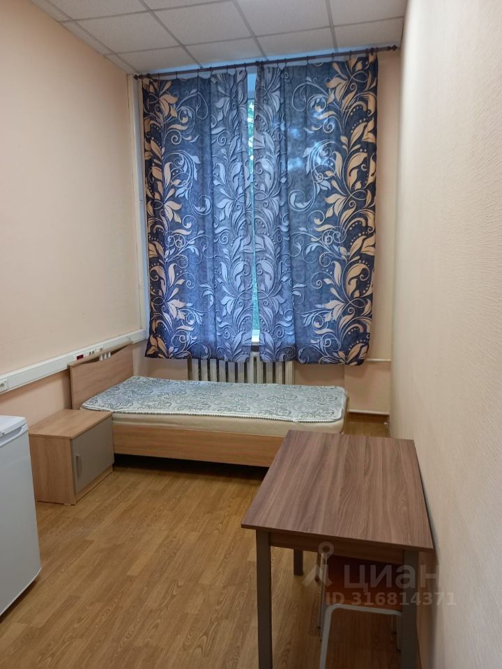 Апартаменты (студия) на длительный срок с собственным санузлом (душевая кабина, раковина, унитаз), полностью меблирована: односпальная кровать (матрас 20 см), стол, стулья, шкаф, зеркало, полки, шторы, холодильник, рядом в коридоре - общая кухня с современными плитами и мойками, есть стиральная машина. С собаками проживание невозможно. Можно с кошкой. Здание располагается на собственной территории, есть круглосуточная охрана, вход в здание по магнитным ключам, полное видеонаблюдение в здании и на территории, система противопожарной безопасности, тревожная кнопка. Кроме ежемесячной арендной платы, арендатор оплачивает услуги ЖКХ, включая отопление в отопительный сезон, вывоз мусора.