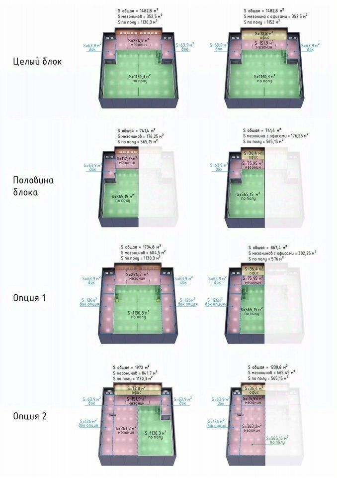 Конструкция и отделка Кровля не эксплуатируемая - 150 мм, мембрана по технологии Технониколь, противопожарные свойства Фасад - 120 см сэндвич панели и 3 слойные стеклопакеты Конструктив - сборный металлический каркас. Вертикальные связи вынесены на фасад для увеличения эффективности внутренних площадей Пол ЖБ плита с двойным армированием - 18 см с антипылевым покрытием LED-освещение Кастомизация от половины здания до объединения соседних блоков Мезонин/антресоль Второй этаж 5,8 м от пола и доков: склад, офис, шоурум, минипроизводство На схеме: мезонин — розовым, офис — жёлтым.