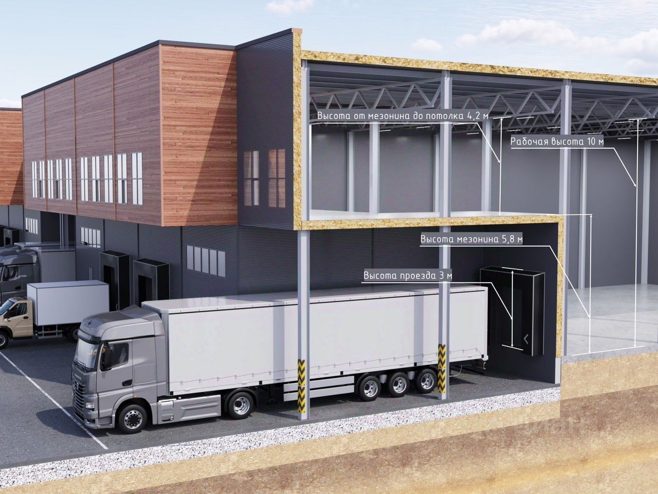 Характеристики склада Класс Б, сухой, теплый Блок: 741,4 м²: пол — 565,15 м², мезонин/антресоль — от 176,25 м² Шаг колонн 12 17 м без вертикальных связей Высота потолков: общая 10 м, мезонин 6 м, разгрузка на уровне 1,1 м Полы: антипылевое покрытие, нагрузка 6 т/м², на мезонине (5,6 м) — 500-1 500 кг/м², стеллажи — до 5 уровней Ворота: 2 шт. на половину блока, кросс-докинг, 2 доклевеллера.