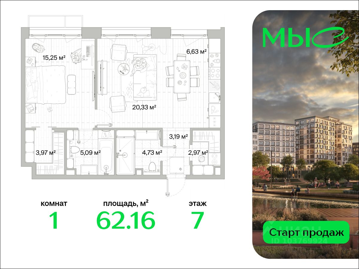 В продаже квартира площадью 62.16 кв. м без отделки на 7 этаже 12 этажного дома. Квартира находится в премиальном жилом комплексе ''МЫС'' (Застройщик - MR Group).