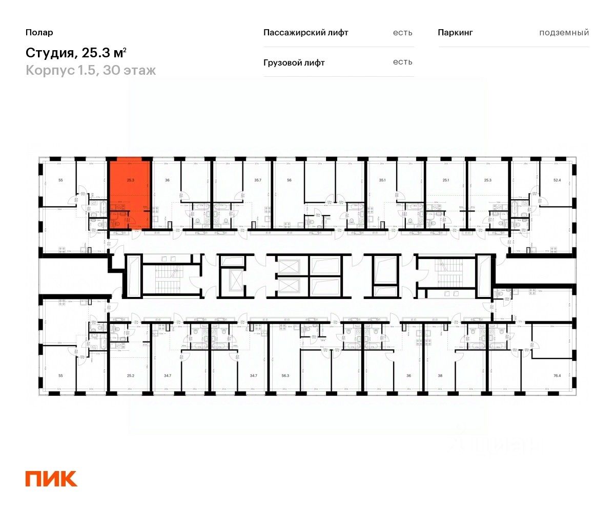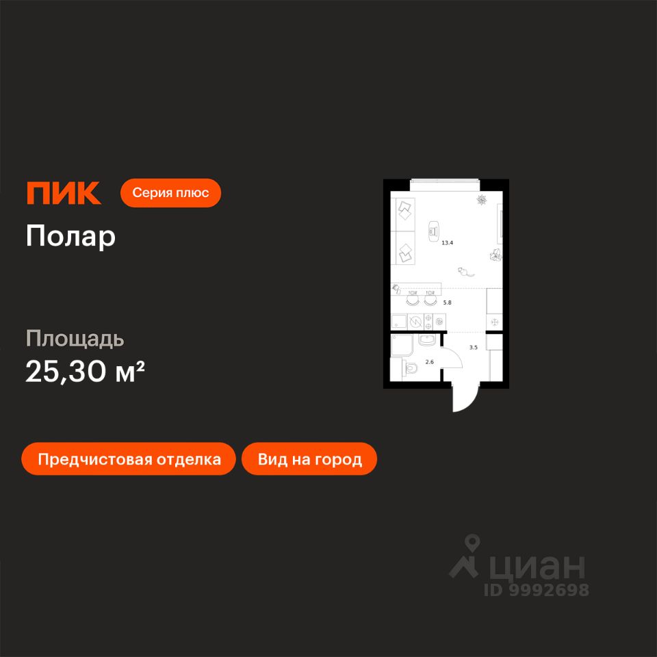 Продаётся квартира-студия площадью 25,3 кв.м на 30 этаже 50 этажного дома (Корпус 1.5, Секция 2) проекта ПИК Полар. Светлый просторный подъезд на уровне земли, функциональная планировка, большие окна, предчистовая отделка.