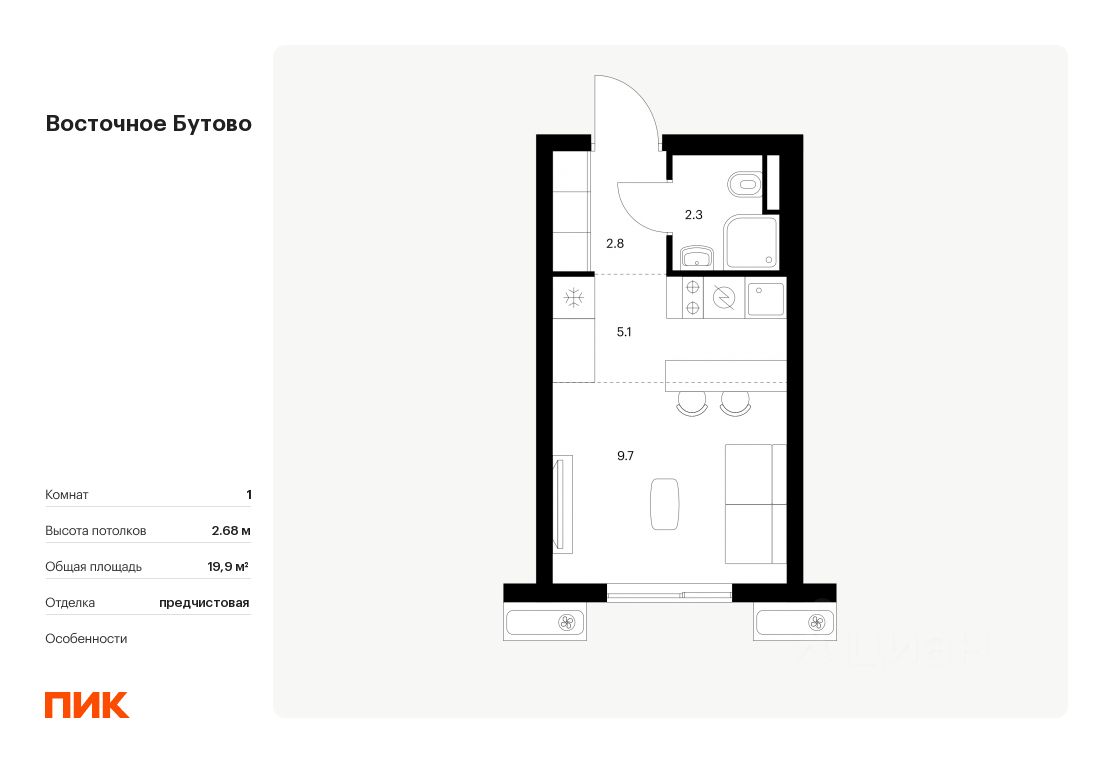 Продаётся квартира-студия площадью 19,9 кв.м на 15 этаже 17 этажного дома (Корпус 48, Секция 2) проекта ПИК Восточное Бутово. Светлый просторный подъезд на уровне земли, функциональная планировка, большие окна, предчистовая отделка.