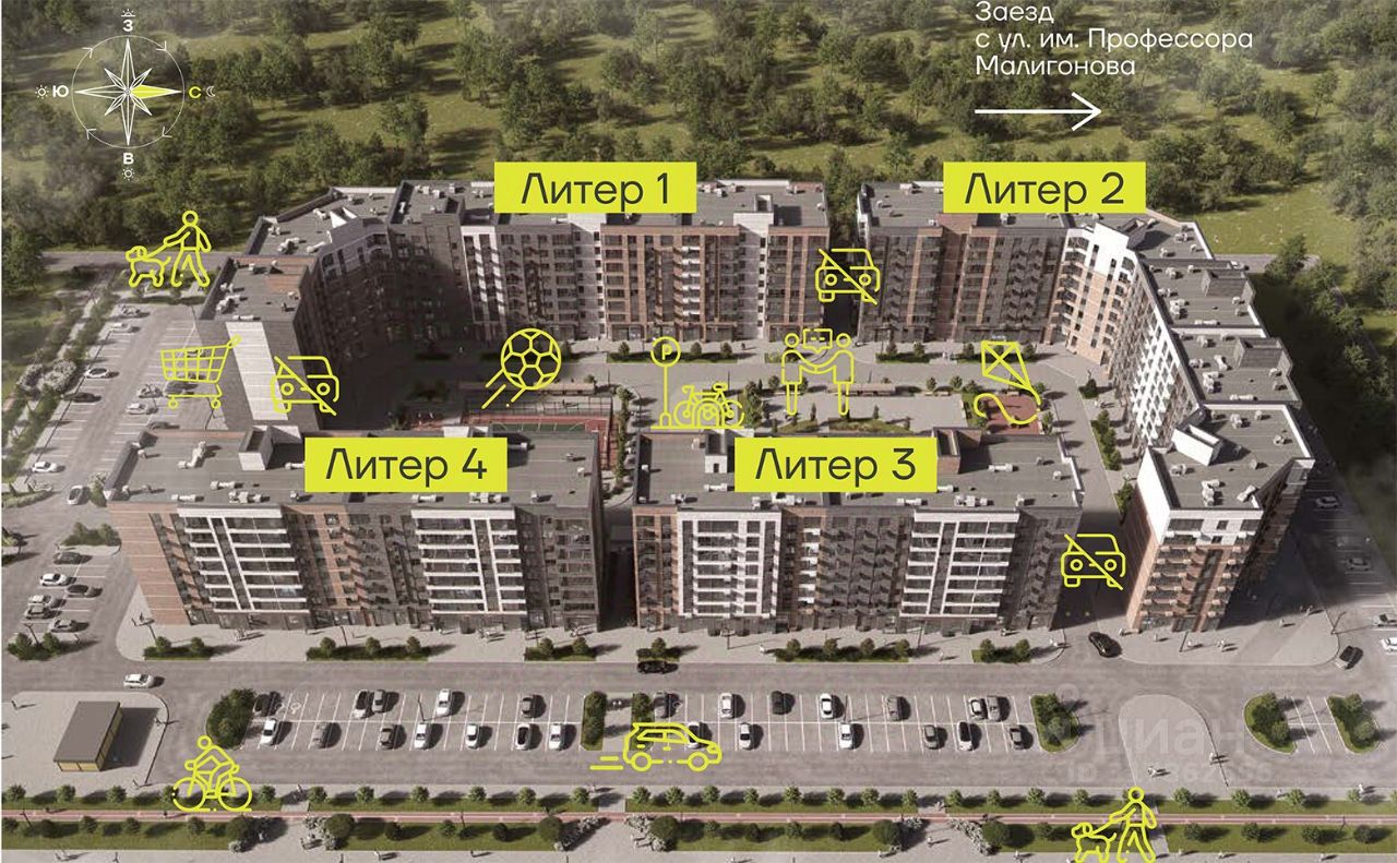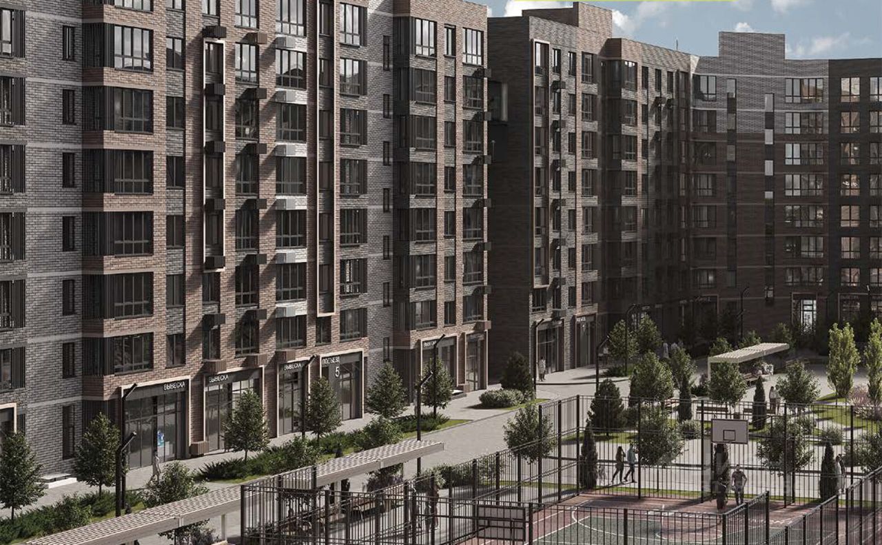 Благоустроенный двор включает: игровые площадки для детей, спортивные площадки, велодорожки, места для отдыха и прогулочные аллеи. На первых этажах находятся коммерческие помещения.