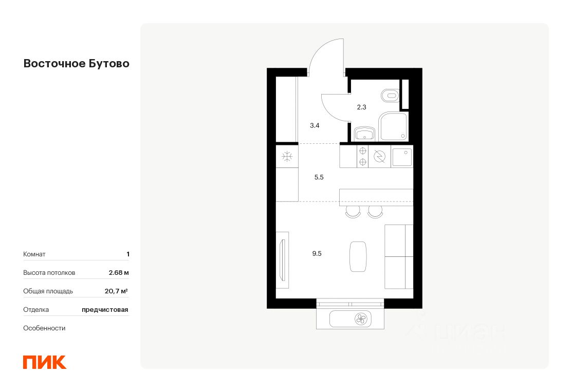 Продаётся квартира-студия площадью 20,7 кв.м на 19 этаже 25 этажного дома (Корпус 47, Секция 3) проекта ПИК Восточное Бутово. Светлый просторный подъезд на уровне земли, функциональная планировка, большие окна, предчистовая отделка.