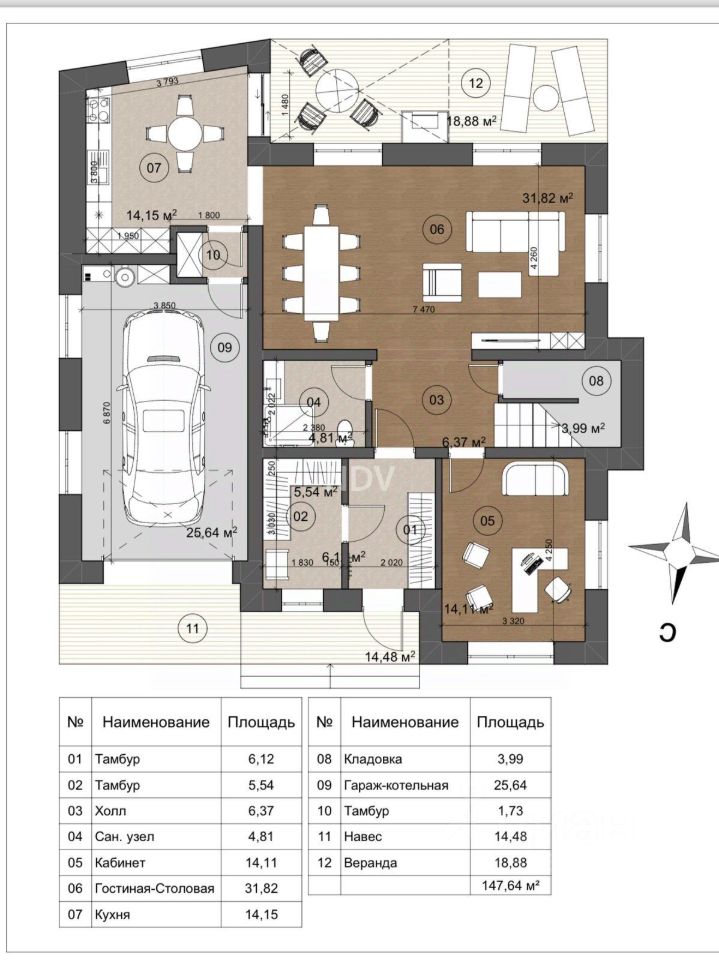 Общая площадь дома с гаражом и террасой -200 м2, встроенный гараж, площадь участка 6,5 соток.