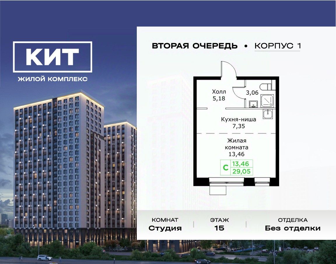 Продаётся студия 29.05 кв.м. без отделки в ЖК ''КИТ2'' на 15-м этаже 25 этажного дома.Жилой комплекс ''Кит 2'' спроектирован в урбанистической концепции ''Город в Городе''. Объект бизнес-класса предлагает рациональный подход к набору опций, необходимых для гармоничной жизни. Проект представляет собой два корпуса, которые образуют единую приватную территорию. Ее доминантой является двор с красивым ландшафтным дизайном и различными зонами, ориентированными на интересы жителей разного возраста. При создании пространства в приоритет ставился комфорт жителей. В шаговой доступности находятся: торговый центр, рестораны, кинотеатры, спортивный зал, образовательные учреждения и множество других объектов в сфере услуг.