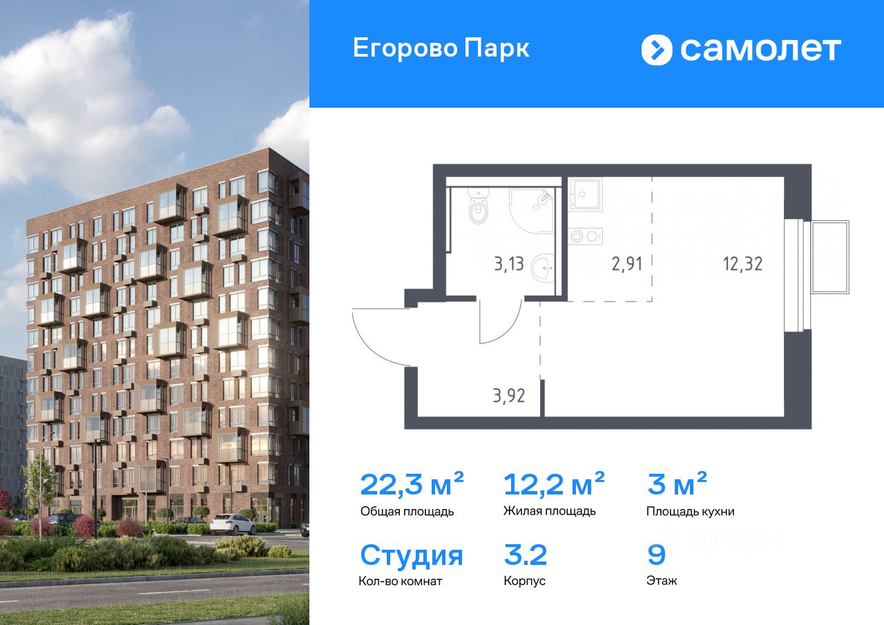 Предлагается квартира студия комфорт-класса 22,28 кв.м в корпусе 3.2 на 9 этаже, в ЖК ''Егорово Парк''