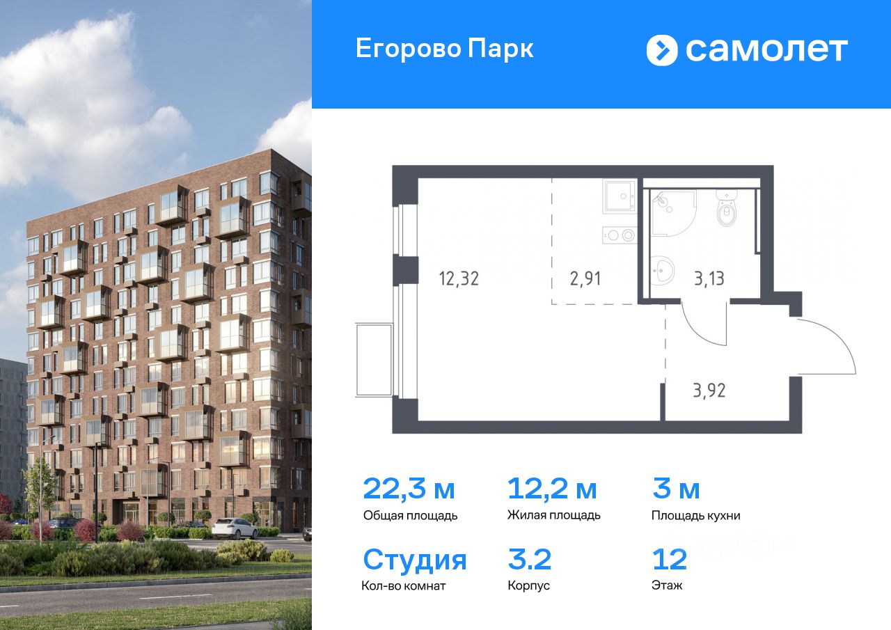 Предлагается квартира студия комфорт-класса 22,28 кв.м в корпусе 3.2 на 12 этаже, в ЖК ''Егорово Парк''
