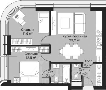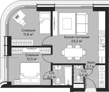 Две изолированные комнаты 11,6 кв м и 12,5 кв м. Одна комната с панорамным круговым остеклением, вторая с изолированным санузлом.