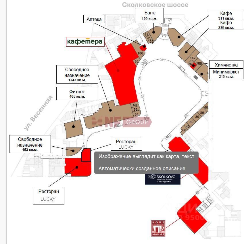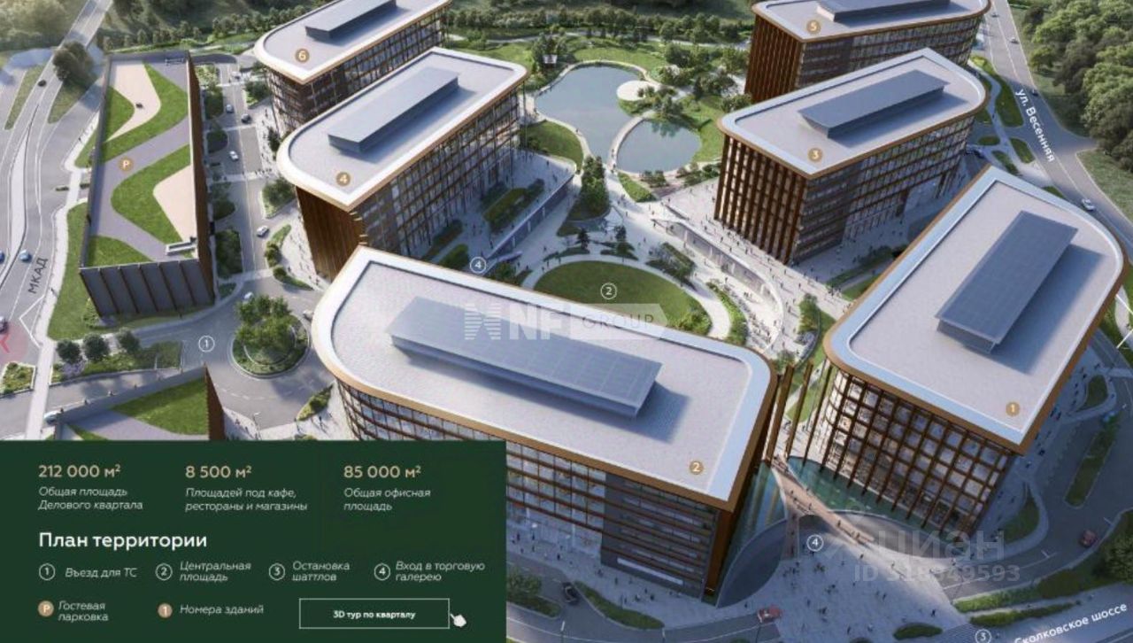 Лот: 34244. Аренда торговых помещений в Деловом квартале Сколково парк. БЦ в процессе заполнения. Введены 2 офисных корпуса (1 корпус сдан - заезд арендатора возможен в марте 2025, 2й корпус - заехал офисный арендатор, выполняется отделка до апреля 2025). 3 и 4 корпус ввод без отделки 1 кв. 2025, с отделкой - ближе к осени 2025, 5 и 6 корпус - ввод в конце 2025 года. Предусмотрены 128 гостевых парковочных мест. Ожидается около 1000 сотрудников к апрелю 2025 + 1000 сотрудников к осени 2025 г. Открытие торговой галереи - 01.06.2025 г. Вакатные площади от 150 до 1250 м2. Помещения подойдут под кафе, ресторан, банк, фитнес студию, минимаркет, студию танцев, галерею, представительский офис и т.д.