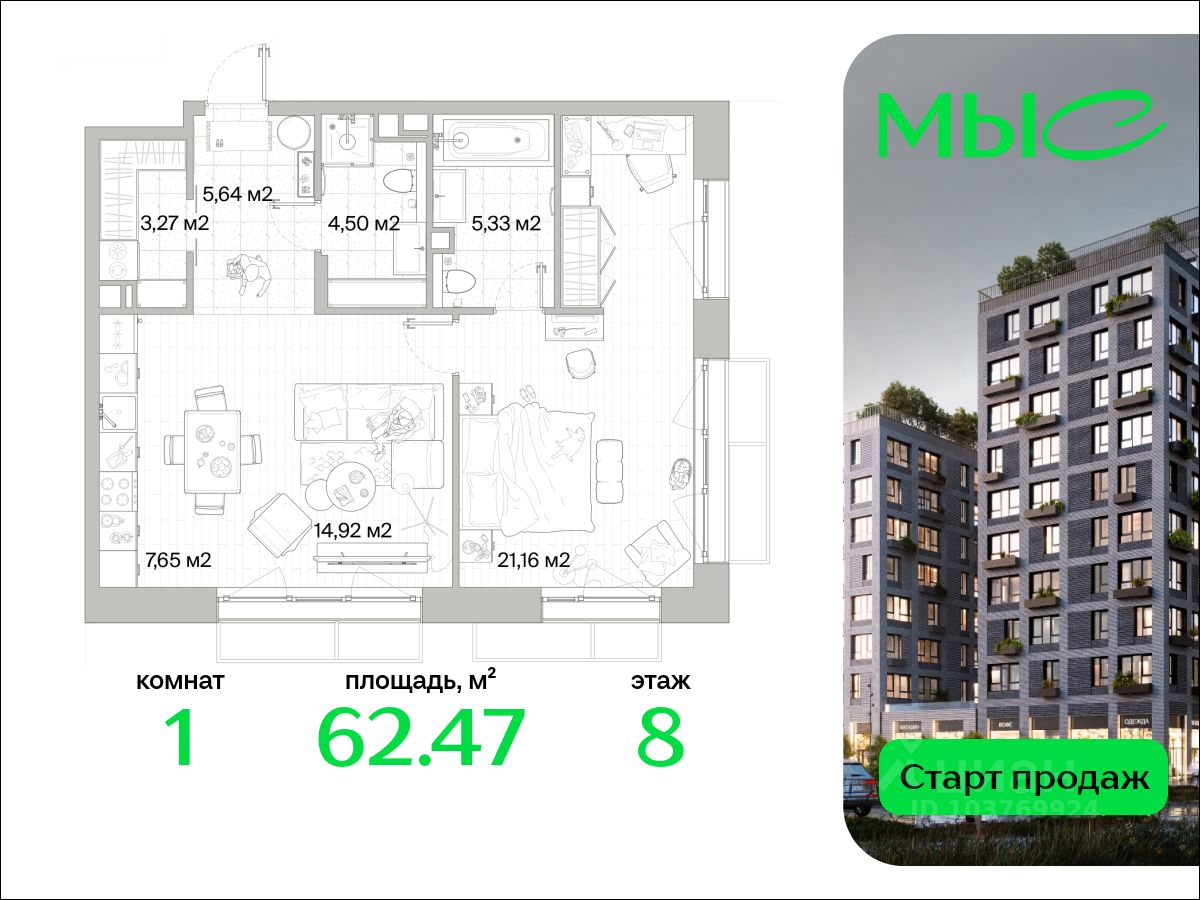 В продаже квартира площадью 62.47 кв. м без отделки на 8 этаже 8 этажного дома. Квартира находится в премиальном жилом комплексе ''МЫС'' (Застройщик - MR Group).