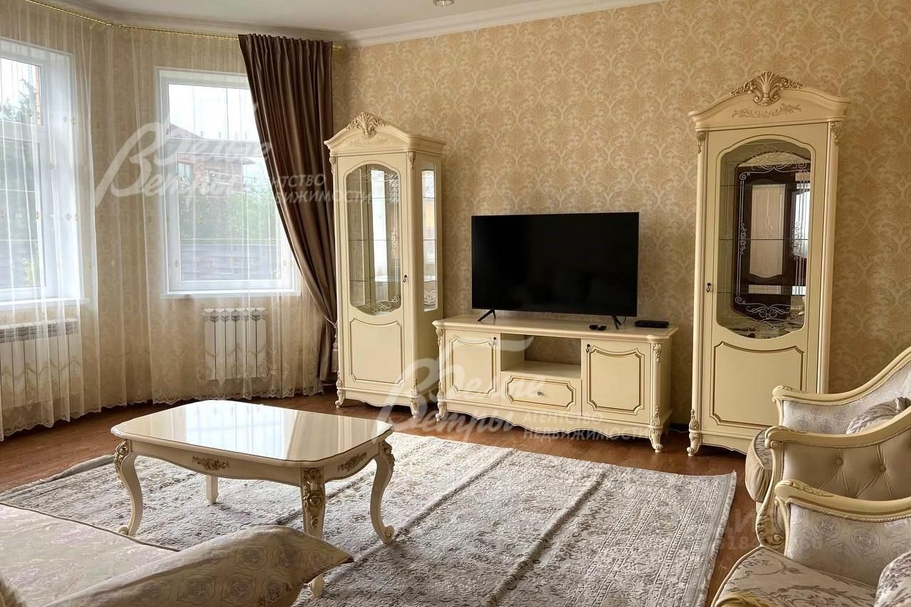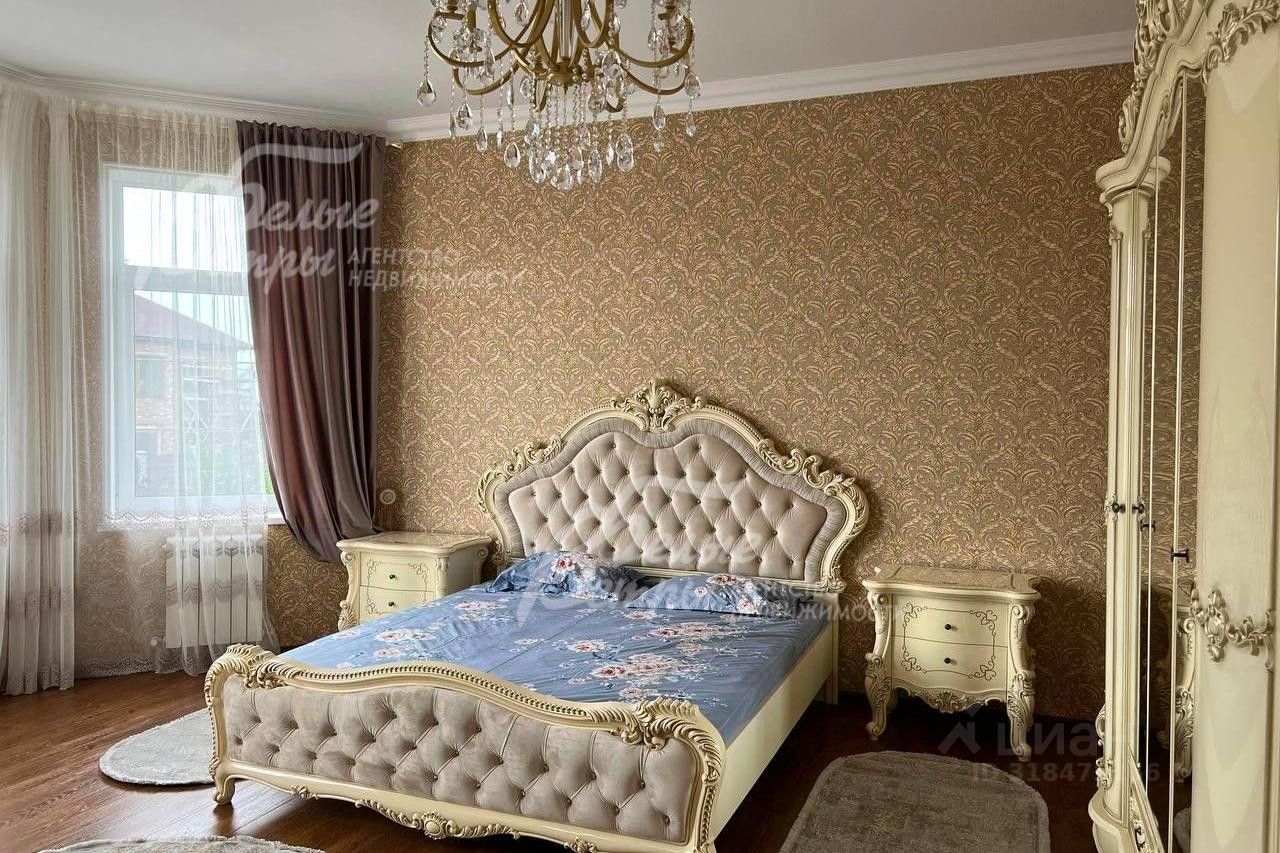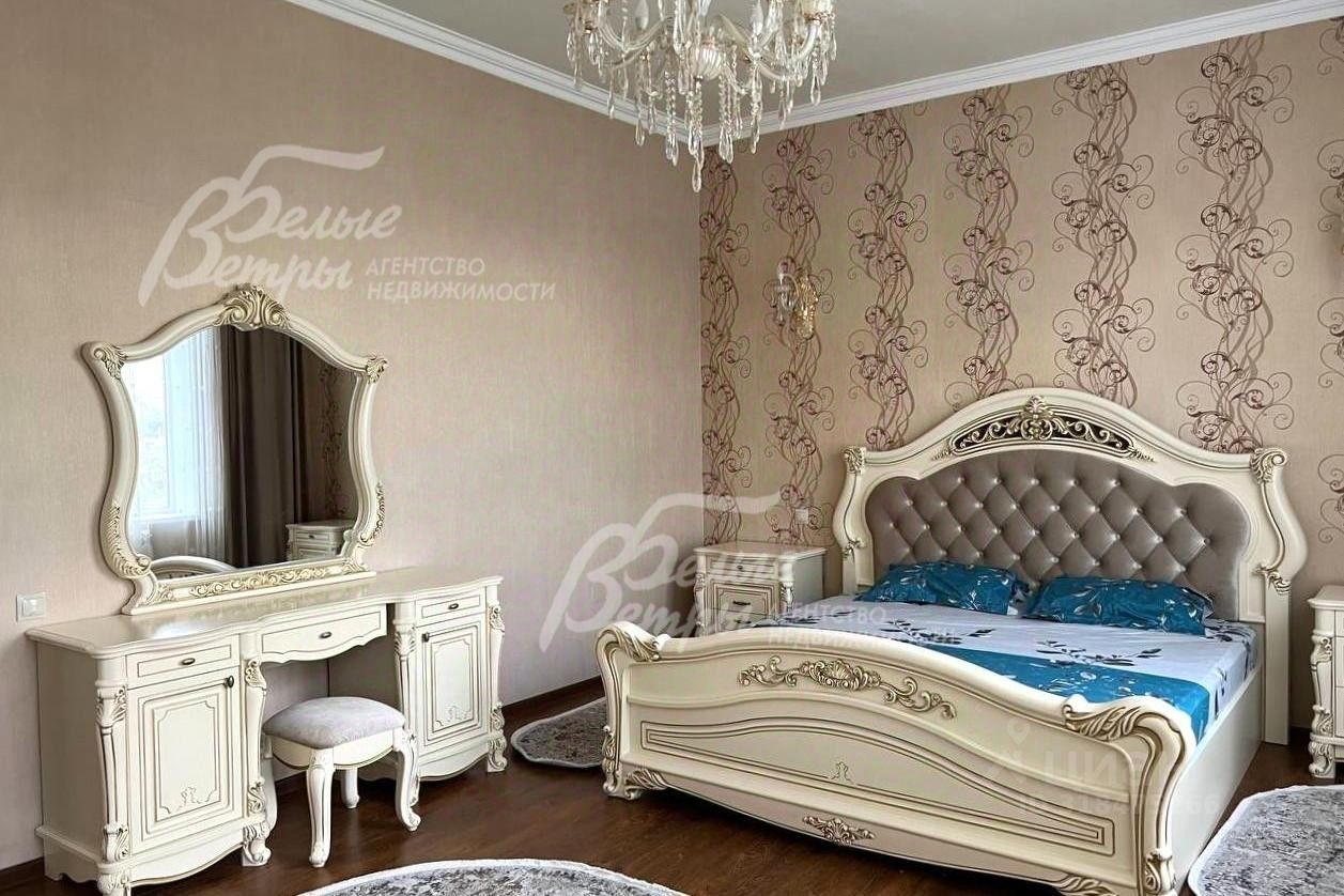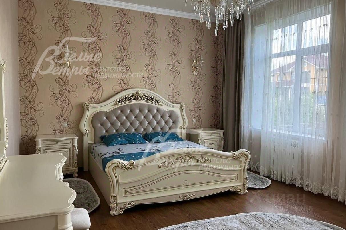 Мебель, оборудование: мебель в кухне, столовой и во всех спальнях - в едином стиле, цвета топленого молока, из резного дерева с ''золотым'' декором. В кухне-столовой полный большой кухонный гарнитур в классическом стиле с фасадами молочного цвета, с витринами для посуды, с островом и полубарным столом, столешница из камня. Гарнитур со встроенной техникой: варочная панель, электрический духовой шкаф, вытяжка, холодильник. В кухне обеденный стол на 6 персон. В зоне столовой-гостиной - обеденная группа на 6 персон (стол с креслами), диван, кресла, журнальный столик, витрины, комод с зеркалом. Во второй гостиной - диван, кресла, шкафы-витрины, тумба, телевизор. В спальнях полные гарнитуры: большие кровати, комоды, трюмо, шкафы с зеркалами. В гостевой спальне над гаражом - большая кровать, тумбы, комод. В мансардной комнате диван, два кресла и журнальный стол. Во всех помещениях: карнизы, занавески, шторы, тюль, ковры, хрустальные люстры, светильники..