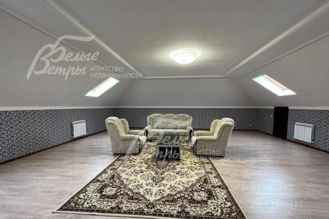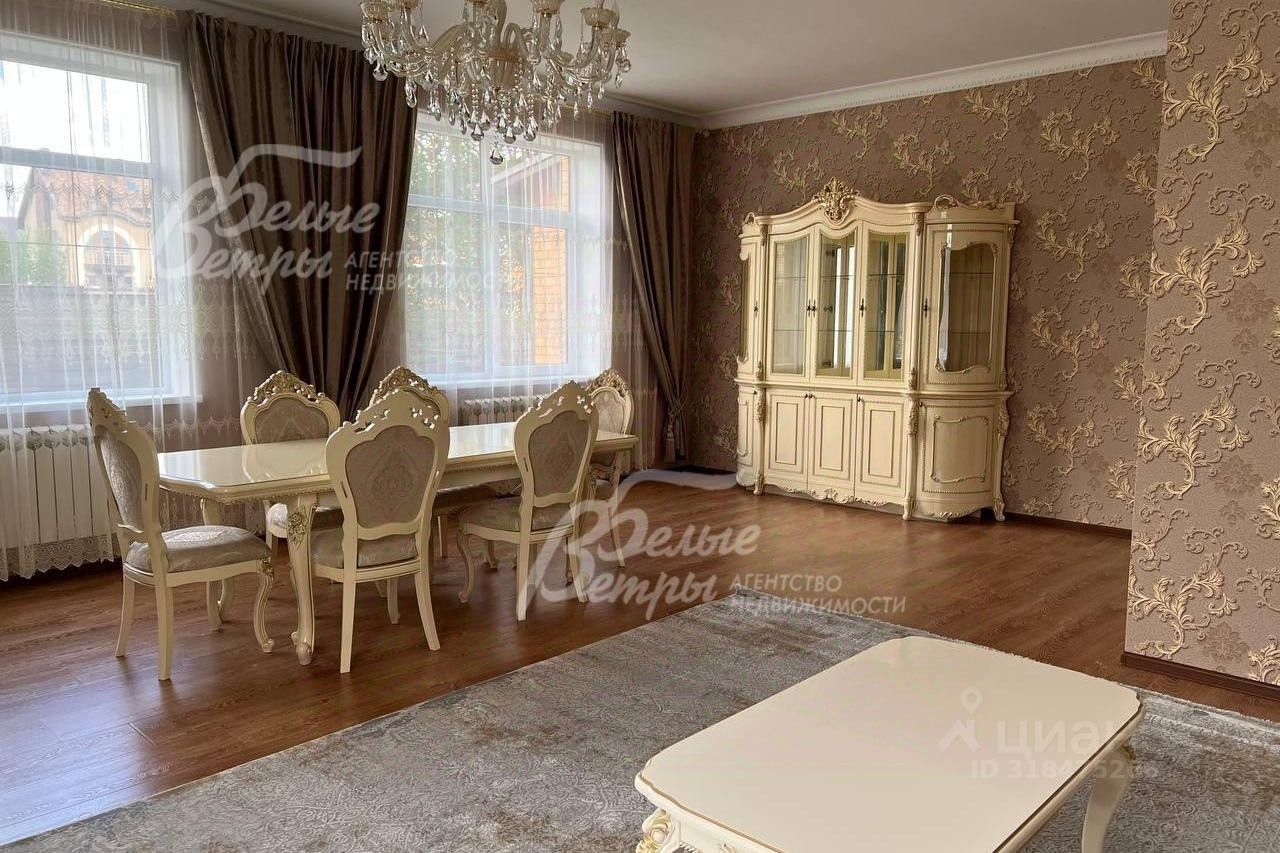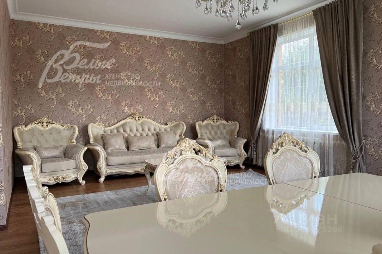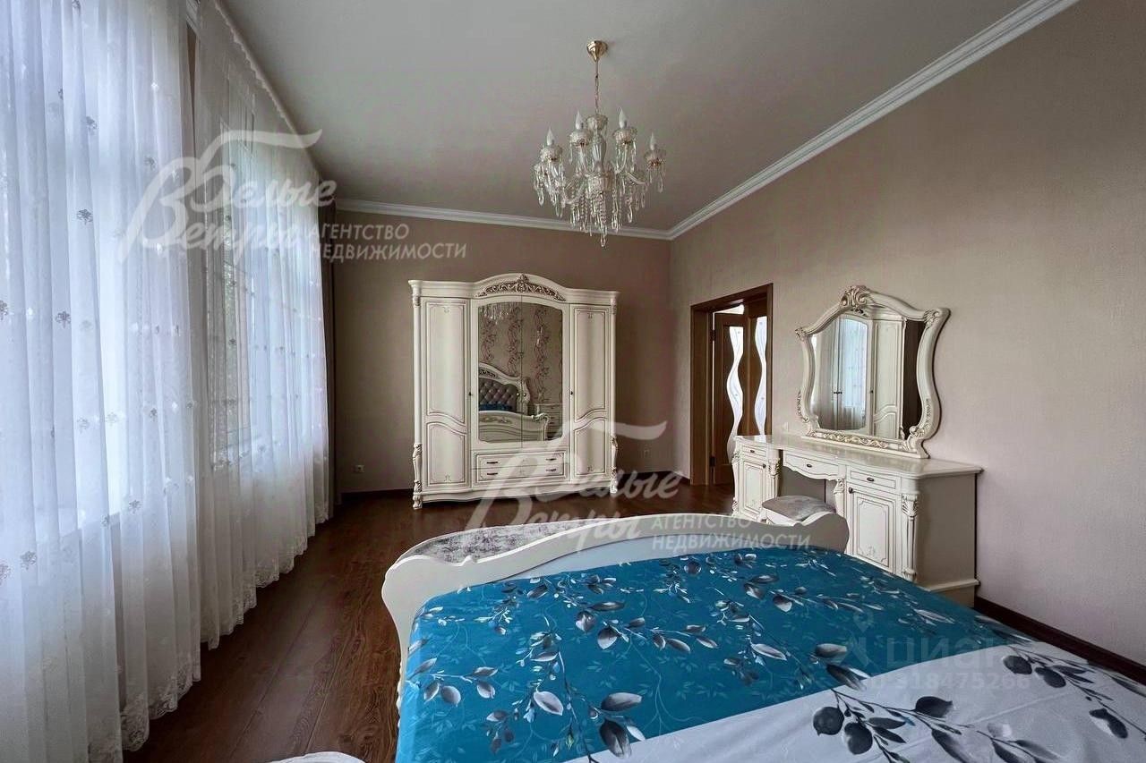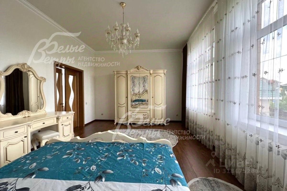 Мебель, оборудование: мебель в кухне, столовой и во всех спальнях - в едином стиле, цвета топленого молока, из резного дерева с ''золотым'' декором. В кухне-столовой полный большой кухонный гарнитур в классическом стиле с фасадами молочного цвета, с витринами для посуды, с островом и полубарным столом, столешница из камня. Гарнитур со встроенной техникой: варочная панель, электрический духовой шкаф, вытяжка, холодильник. В кухне обеденный стол на 6 персон. В зоне столовой-гостиной - обеденная группа на 6 персон (стол с креслами), диван, кресла, журнальный столик, витрины, комод с зеркалом. Во второй гостиной - диван, кресла, шкафы-витрины, тумба, телевизор. В спальнях полные гарнитуры: большие кровати, комоды, трюмо, шкафы с зеркалами. В гостевой спальне над гаражом - большая кровать, тумбы, комод. В мансардной комнате диван, два кресла и журнальный стол. Во всех помещениях: карнизы, занавески, шторы, тюль, ковры, хрустальные люстры, светильники..