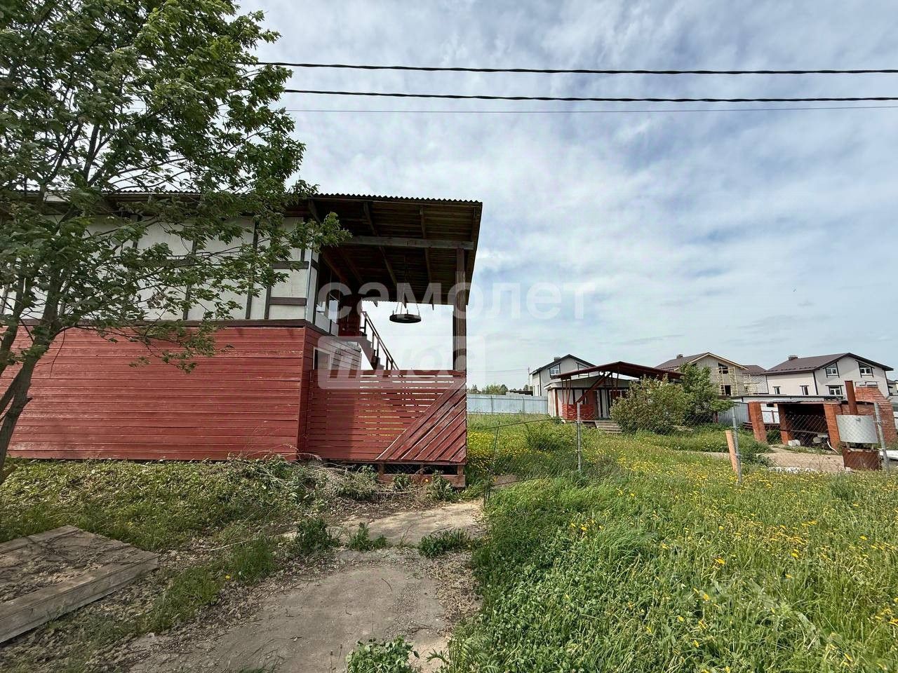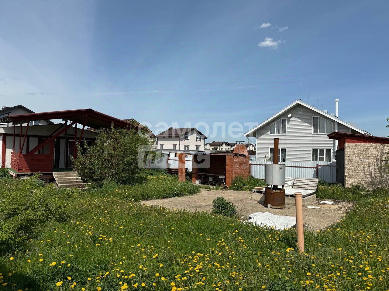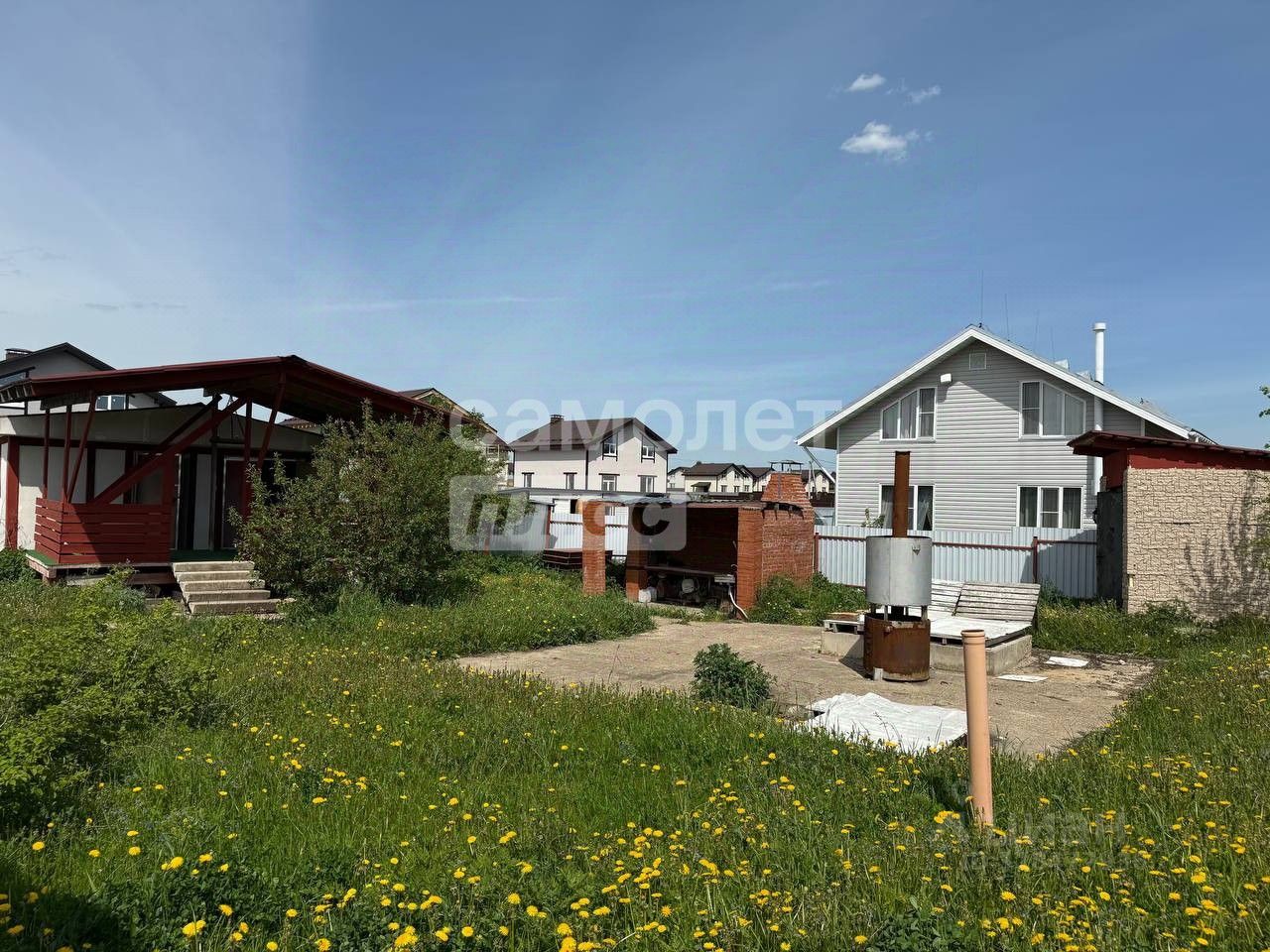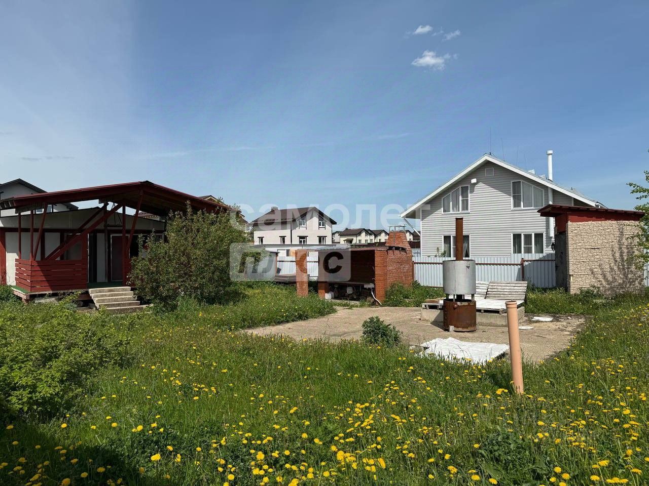 На участке расположены небольшой дом, баня, мангальная зона, А также залит фундамент под основной дом.