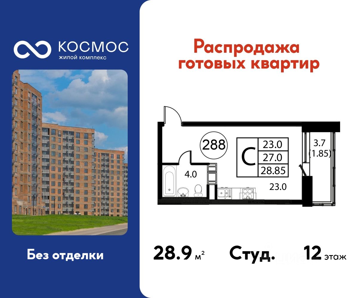 Продаётся студия в сданном доме (Корпус 7), срок сдачи: 2-кв. 2025, общей площадью 28.85 кв.м., на 12 этаже.
