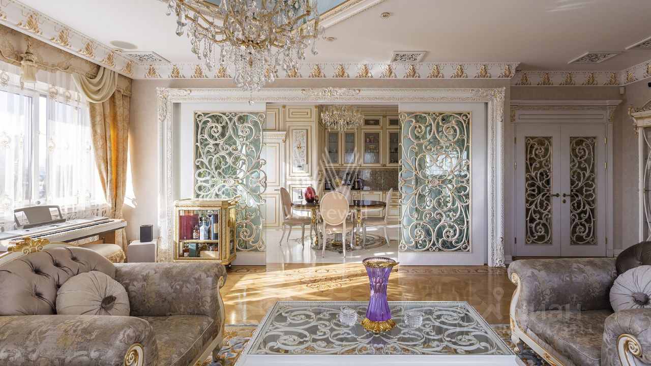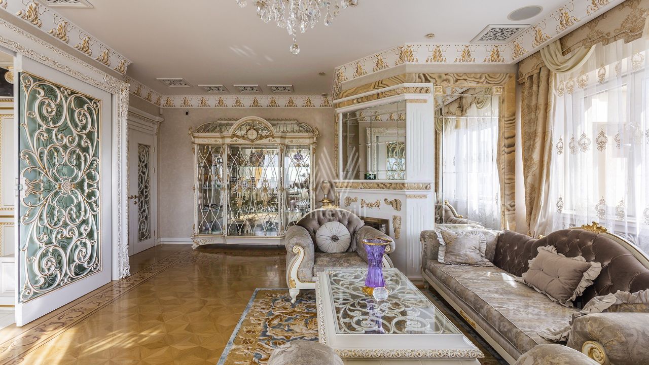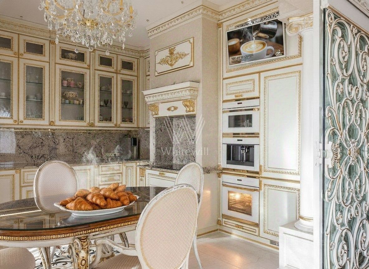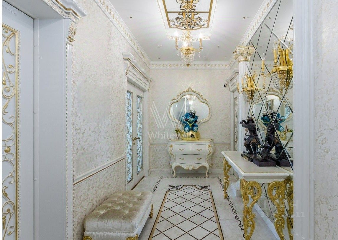Эксклюзив Whitewill. Квартира с четырьмя спальнями общей площадью 205 м² в клубном доме ''Лужники Хаус'' в Хамовниках. На этаже всего две квартиры, что обеспечивает дополнительную приватность. Выполнена авторская отделка в дворцовом стиле, интерьеры украшают колонны, дизайнерские люстры, резные и лепные детали, венчающий карниз и графика на стенах и потолках.