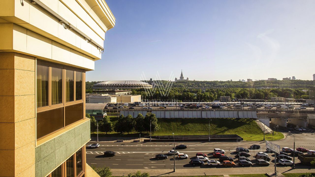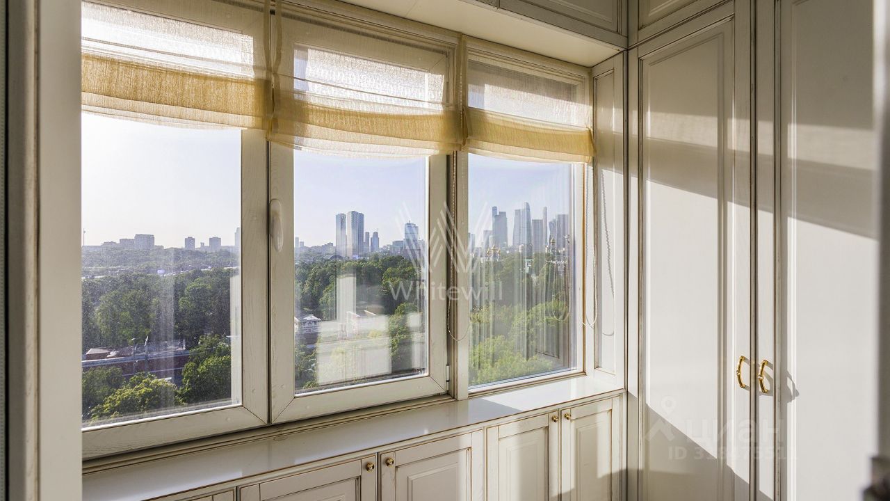 Планировка включает гостиную с био-камином, кухню-столовую, мастер-спальню с собственным санузлом и выходом на балкон, три спальни, четыре санузла, гардеробную, кладовую, два балкона и холл. Из окон открываются виды на спортивный комплекс ''Лужники'', Новодевичий парк, башни ''Москва-Сити'' и на благоустроенную территорию комплекса. Предусмотрено три машино-места в подземном паркинге.