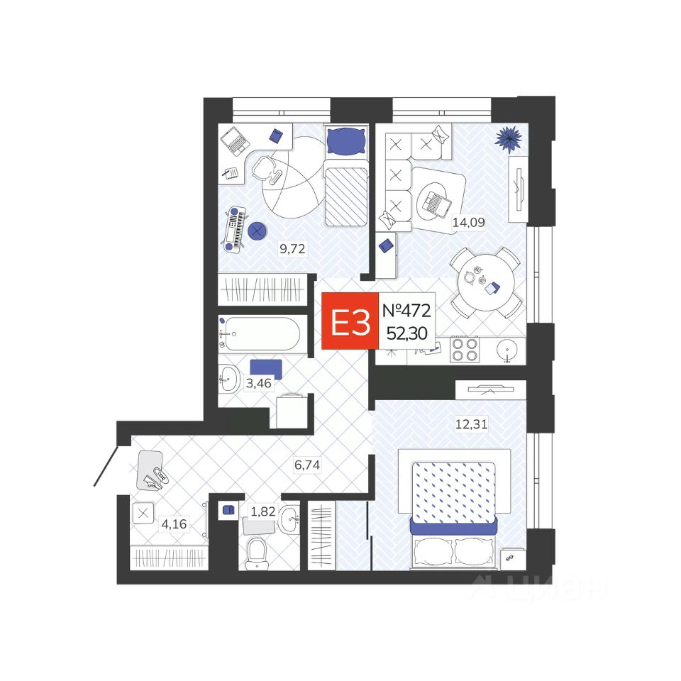 Общая площадь52,3 м2