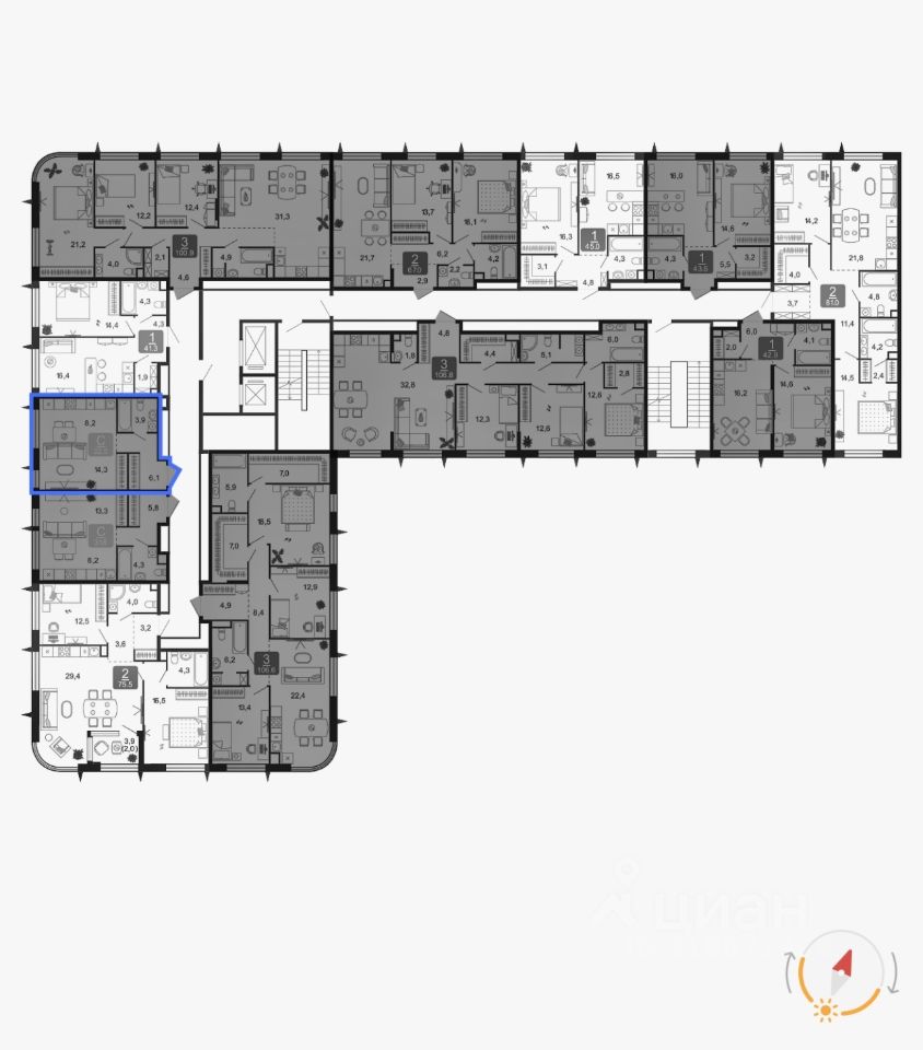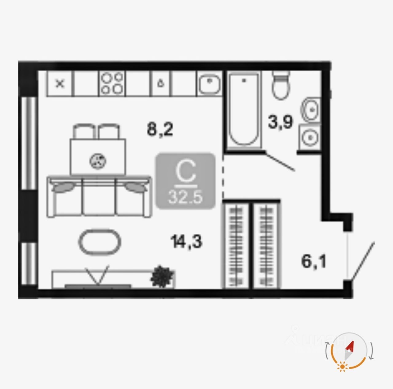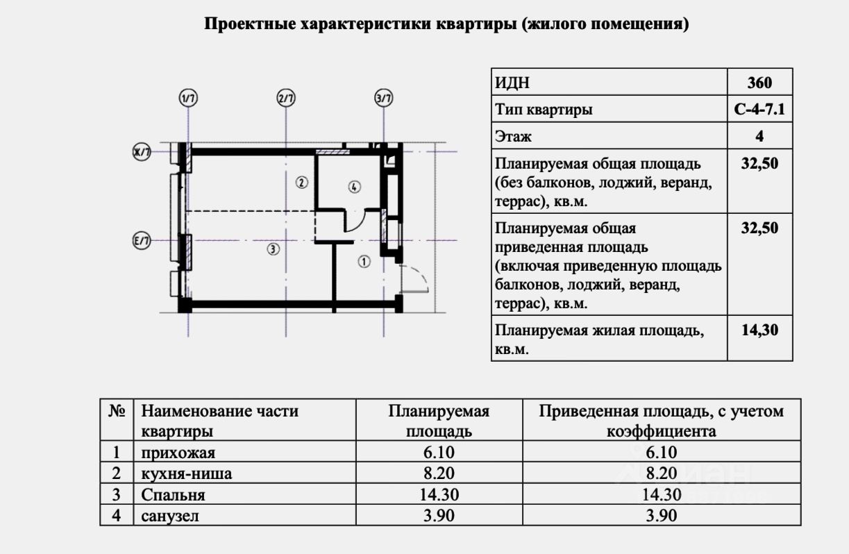 Общая площадь 32.5 кв.м., Корпус 7, Секция 7.1, Этаж 4, ИДН 360, Тип: С-4-7.1, Потолки 3.1 м., окна на юго-запад.