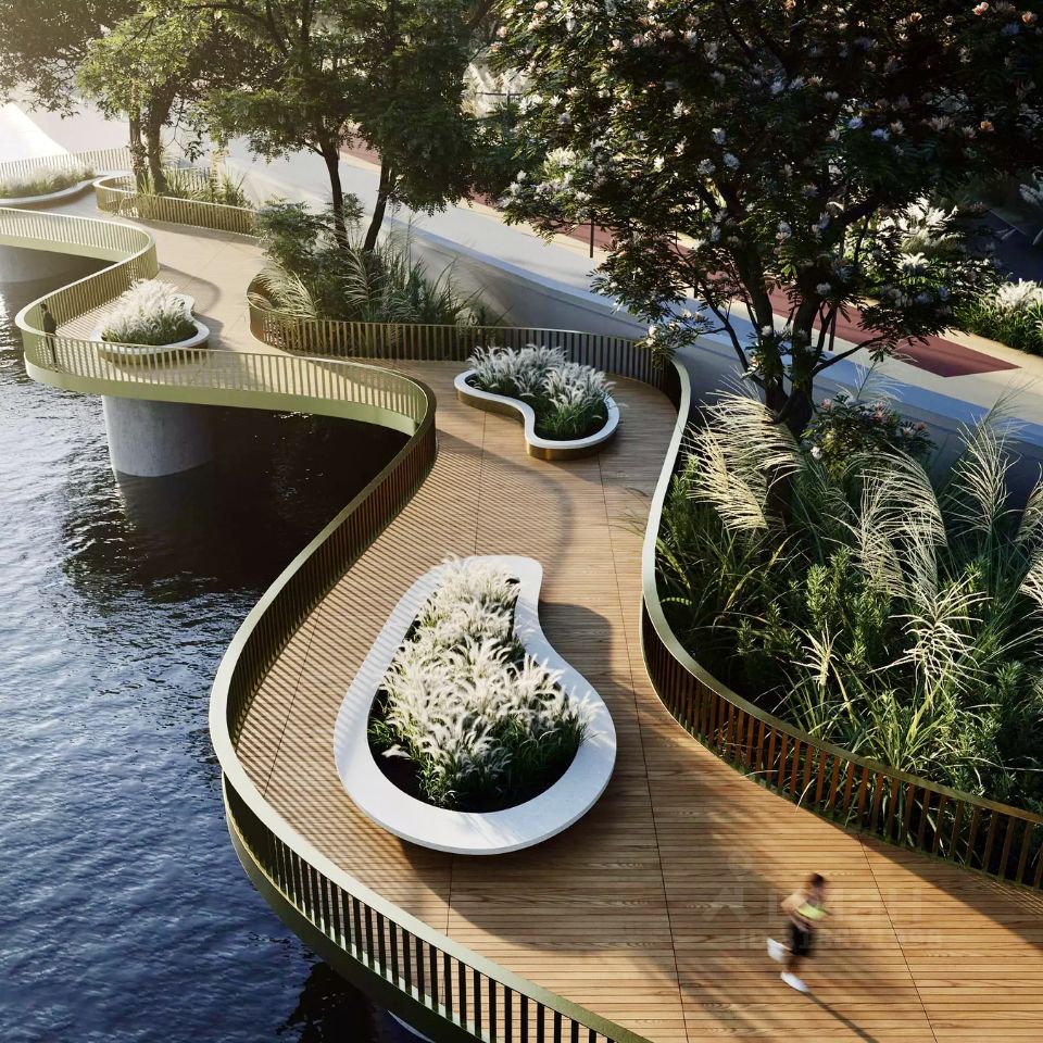 Весь район спроектирован на основе принципа 15-минутной доступности необходимой инфраструктуры и продуманных прогулочных маршрутов. На первых этажах предусмотрены коммерческие помещения. В подземной части зданий находятся паркинги и кладовые помещения. Также проектом предусмотрено благоустройство набережной и создание 4-километровой парковой зоны и первого в столице водного парка.