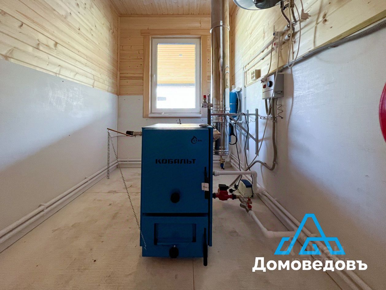 Коммуникации: - Вода скважина на участке, водонагреватель, вода проведена в кухню и санузлы. В двух санузлах одна душевая кабина, две раковины, два унитазы, смесители. - Канализация локальное очистное сооружение. - Электричество 15 кВт, свет, розетки и выключатели. - Отопление котел на твердом топливе и электричестве, радиаторы, антифриз в системе отопления.