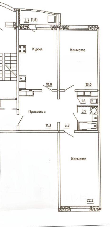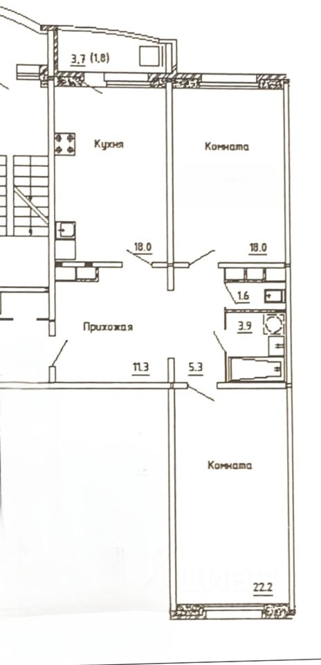 Общая площадь- 80,1 кв м, кухня-17,9 кв.м.,комнаты изолированные - 22.1 кв.м. и 18,0 кв.м., С/у раздельный.