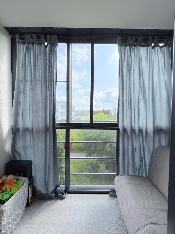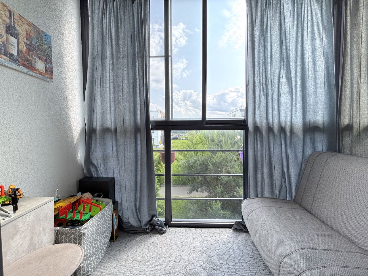 Широкие оконные проемы, благодаря которым в комнаты поступает много света. Просторный балкон с диваном и окнами в пол.