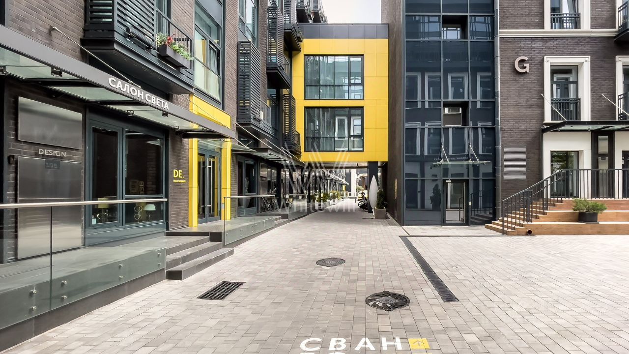 Высокие потолки, панорамное остекление. Окна выходят в благоустроенный внутренний двор.