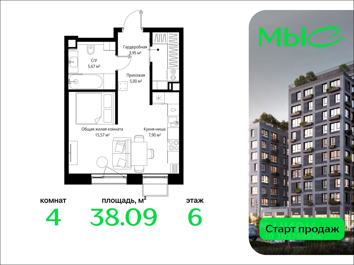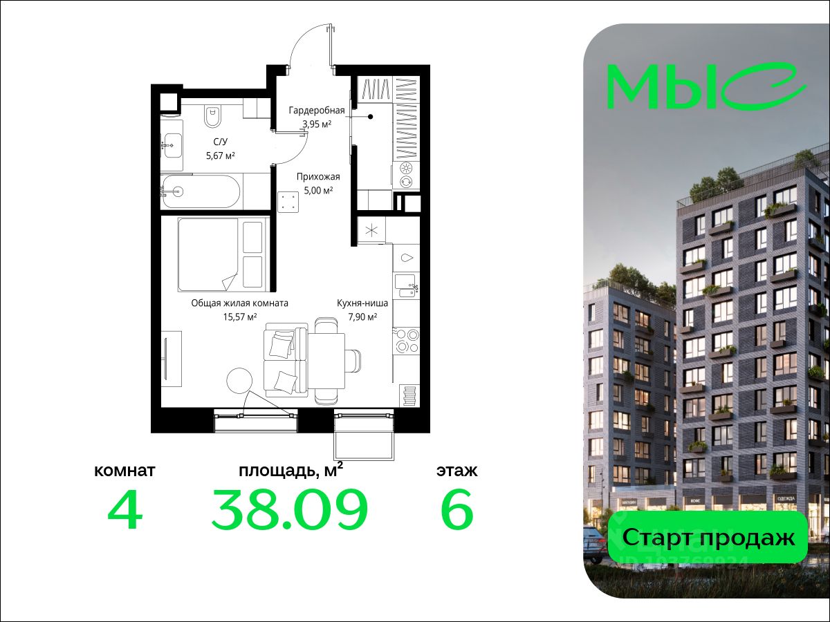 В продаже квартира площадью 38.09 кв. м без отделки на 6 этаже 8 этажного дома. Квартира находится в премиальном жилом комплексе ''МЫС'' (Застройщик - MR Group).