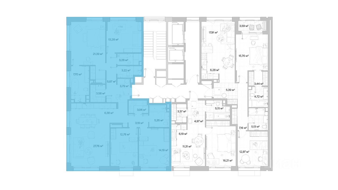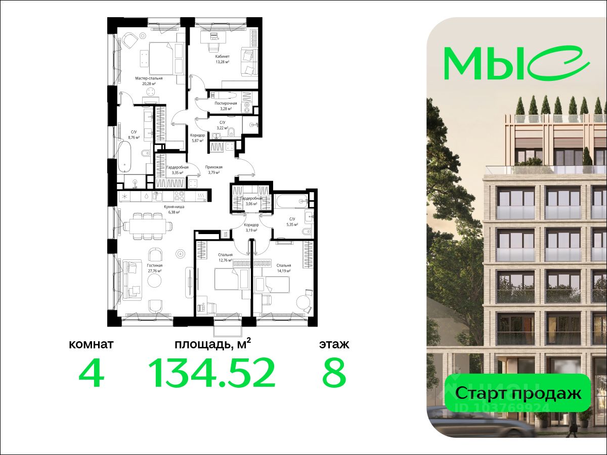 В продаже квартира площадью 134.52 кв. м без отделки на 8 этаже 8 этажного дома. Квартира находится в премиальном жилом комплексе ''МЫС'' (Застройщик - MR Group).