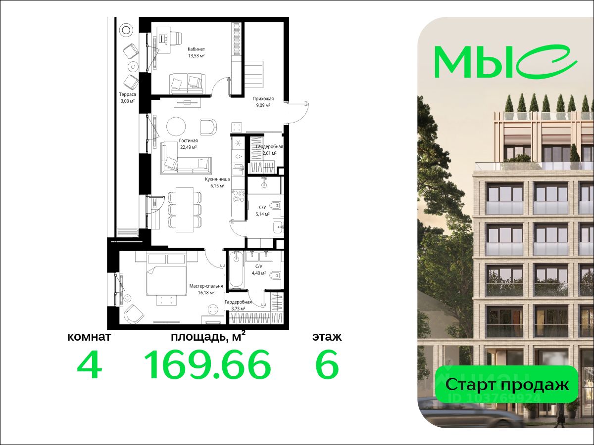 В продаже квартира площадью 169.66 кв. м без отделки на 6 этаже 10 этажного дома. Квартира находится в премиальном жилом комплексе ''МЫС'' (Застройщик - MR Group).