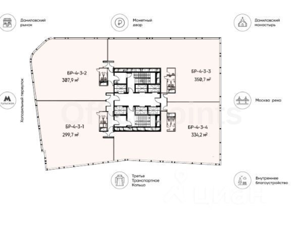 Продается офисное помещение на 4 этаже в БЦ Башня Рябов, А класса, который находится по адресу: Холодильный пер., д. 3, к. 1.