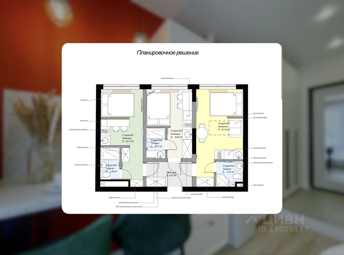Апартаменты с современным ремонтом разделены на три изолированные студии ~ по 15 кв.м. Каждая студия полностью укомплектована мебелью, техникой, всем необходимым для сдачи жилья.