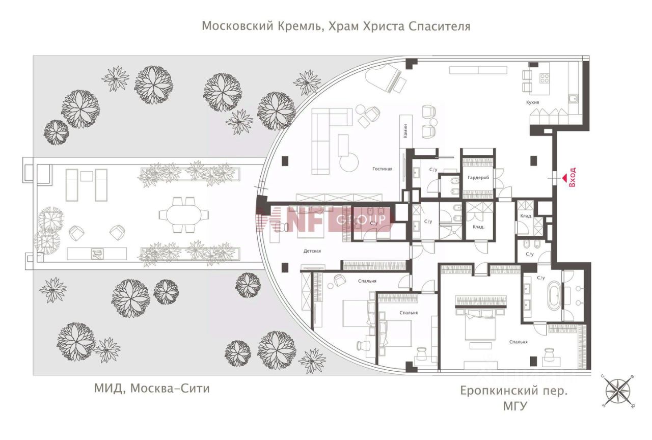 Лот: 6113. Эксклюзивно в продаже только у NF GROUP. В продаже пентхаус свободной планировки с террасой в элитном клубном доме ''Еропкинский, 16''. Оптимальный вариант организации пространства: гостиная с обеденной зоной и возможностью организации дровяного камина, кухня-столовая, мастер-спальня с ванной комнатой и двумя гардеробными, кабинет, две или три детские спальни с ванными комнатами, несколько гардеробных комнат, постирочная и холл. Из гостиной и столовой есть выход на террасу площадью 75 м2. Установлены современные инженерные системы (приточно-вытяжная вентиляция и кондиционирование). Выполнено панорамное остекление, в квартире много света. Из окон, ориентированных на 3 стороны света, открывается красивый вид на храм Христа Спасителя, центр Москвы, доходный дом Исакова, Москва-Сити, МИД. Высота потолка 3,4 м. В стоимость входят 4 машино-места в подземном паркинге. Квартира расположена в клубном доме в тихих односторонних переулках на Остоженке. Огороженная охраняемая территория, презентабельная входная группа, профессиональная управляющая компания. В пешей доступности расположены памятники архитектуры, школы из списка лучших в Москве, рестораны, магазины, деловые центры. Удобный выезд в нескольких направлениях, пешая доступность метро ''Кропоткинская'' и ''Парк Культуры''.