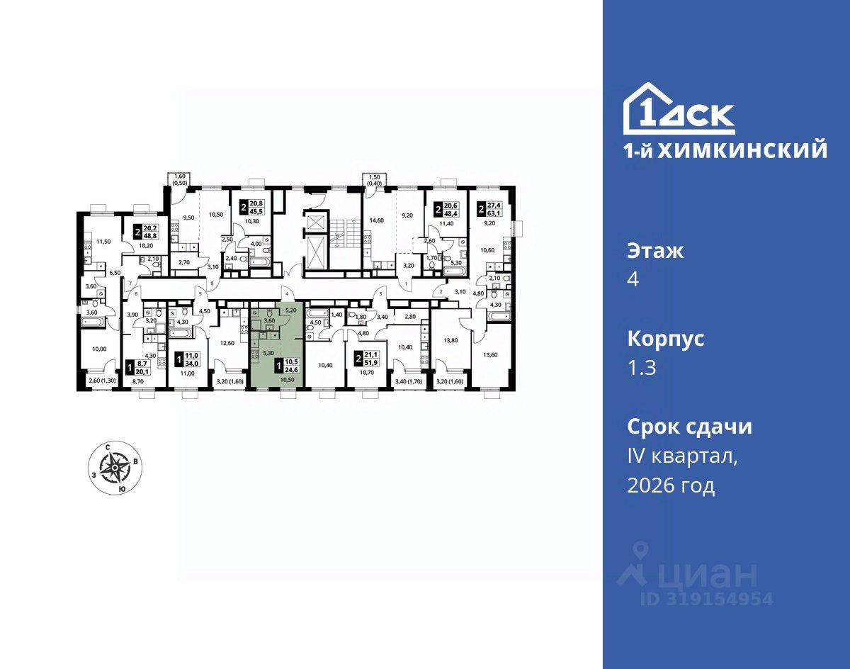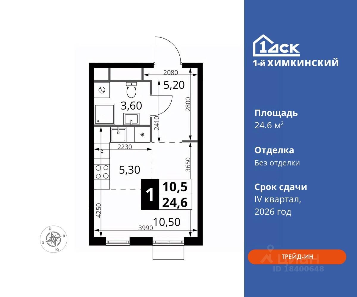 Прямая продажа от застройщика! Жилой Комплекс класса Комфорт. Продаётся студия номер 20 общей площадью 24.6 кв.м на 4-м этаже 17 этажного дома. Без отделки.