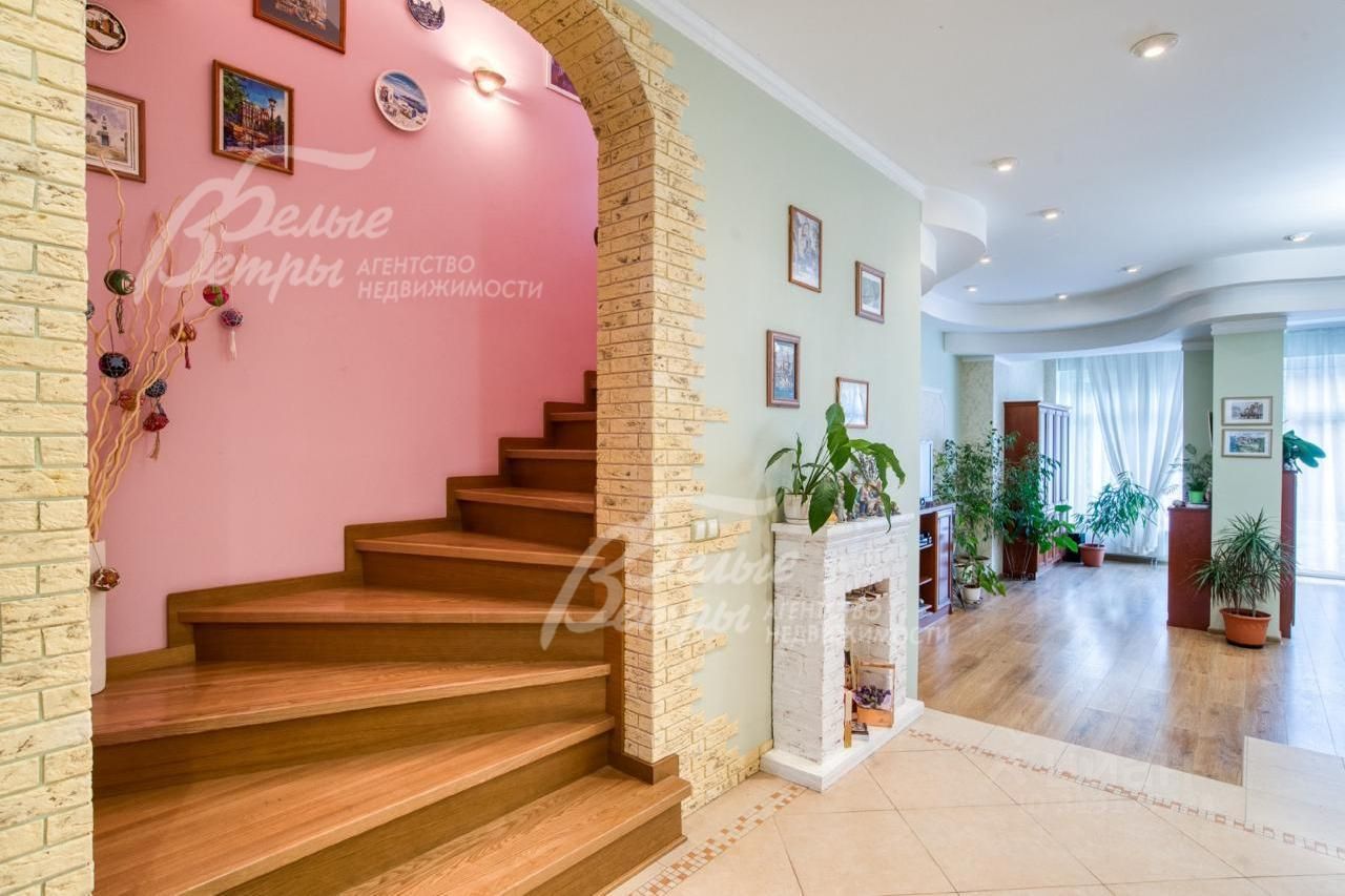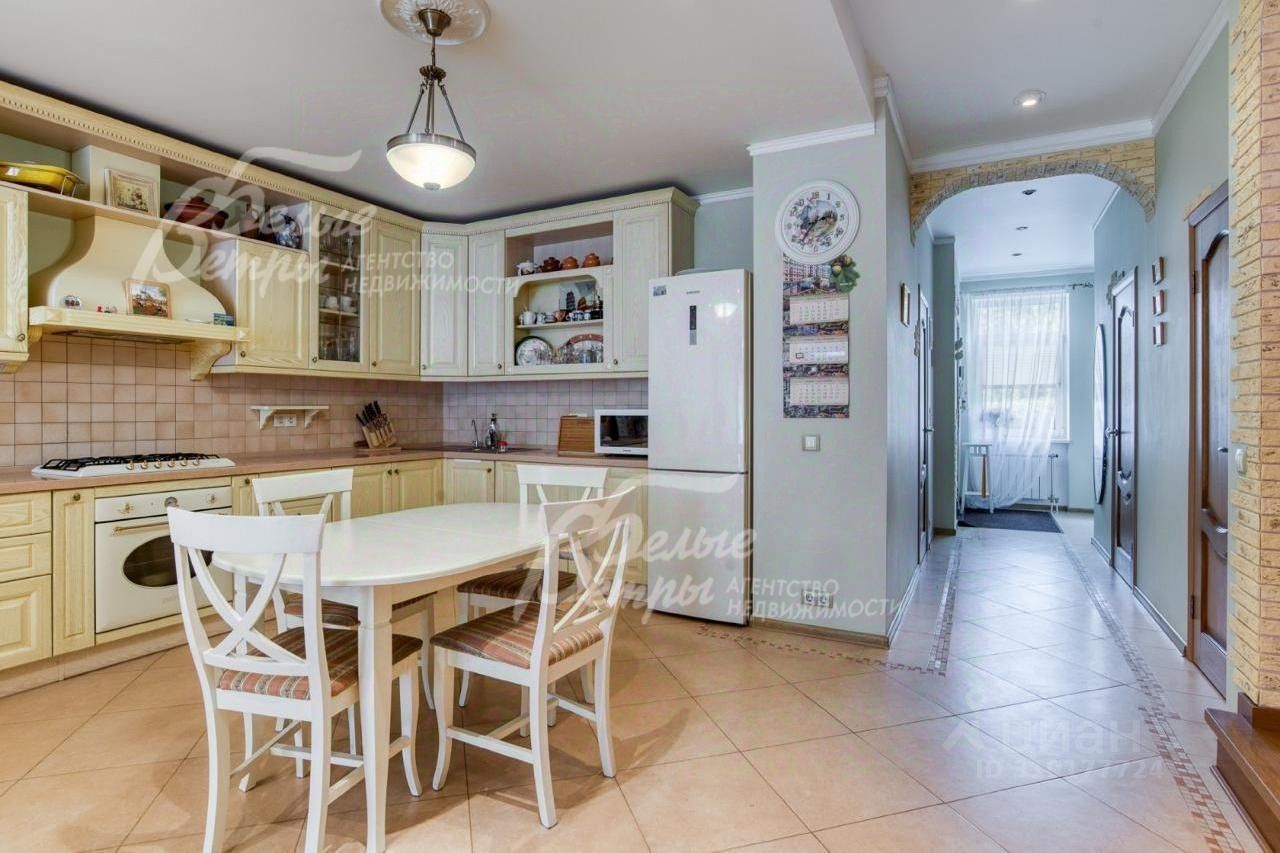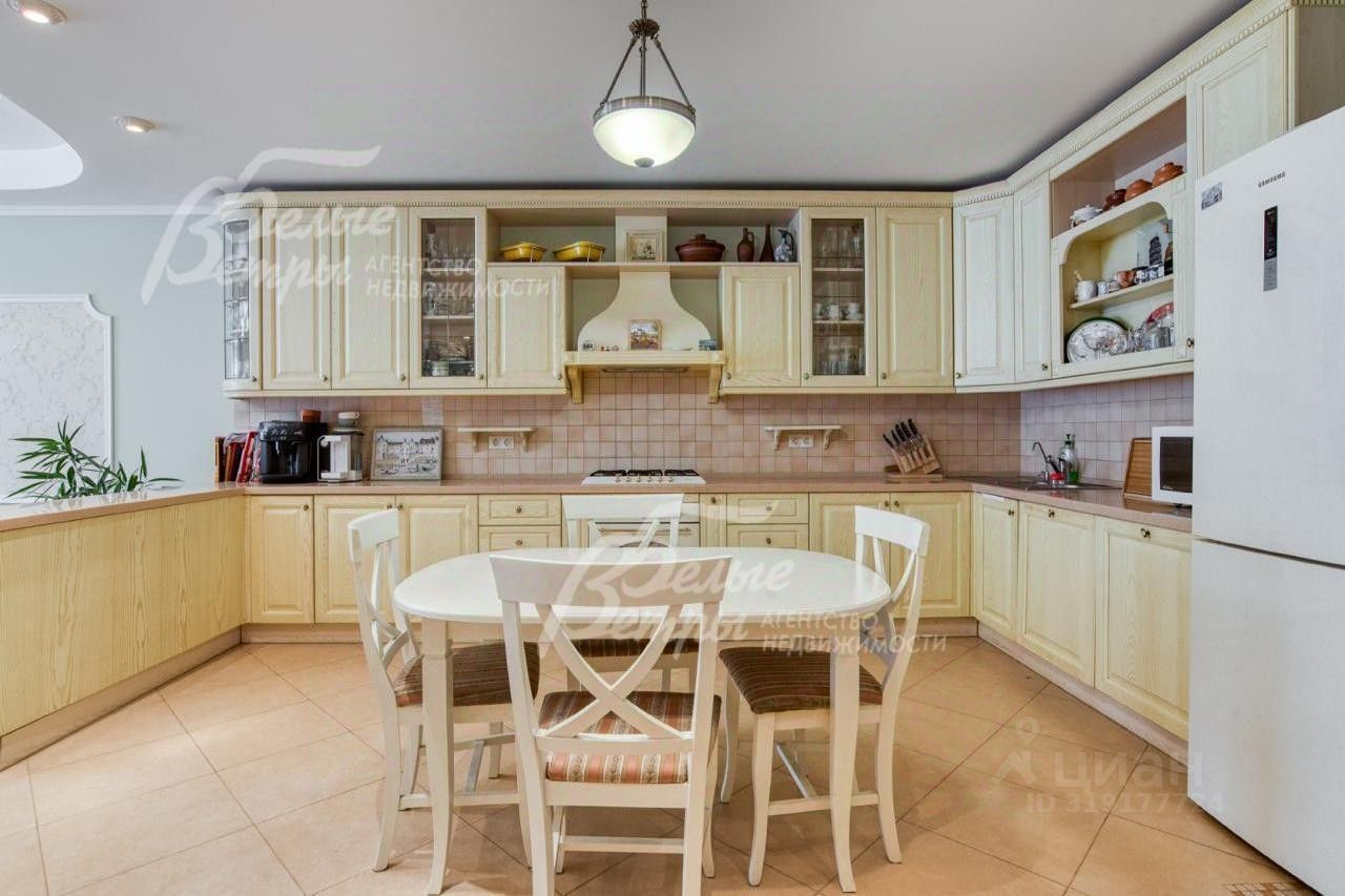 Описание внутренней отделки: отделка выполнена дорогостоящими импортными материалами в классическом стиле в светлых тонах. На стенах в гостиной, на кухне, коридорах обои под покраску, в спальнях обои, в том числе панно из обоев, в санузлах коллекционная плитка. На полу инженерная (паркетная) доска из дуба, ламинат, керамогранит с водяным подогревом на 1-м этаже и в санузлах 2-го и мансардного этажа. Разноуровневые потолки из гипсокартона с подсветкой и панелями. Установлены филёнчатые дубовые межкомнатные двери, подоконники ПВХ. На второй этаж ведёт монолитная лестница со ступенями, обшитыми износостойкой породой дерева дубом.