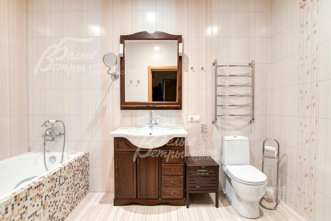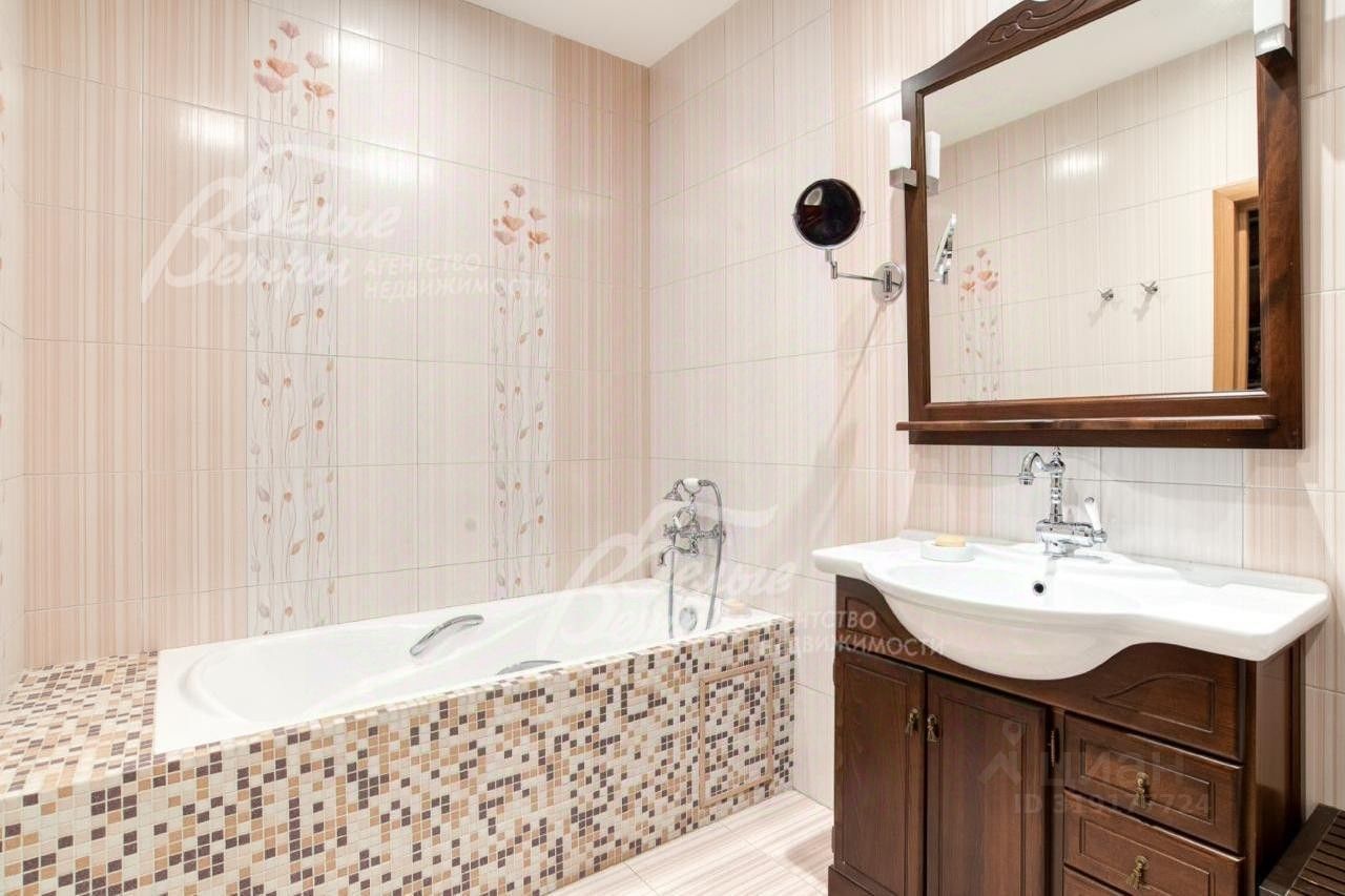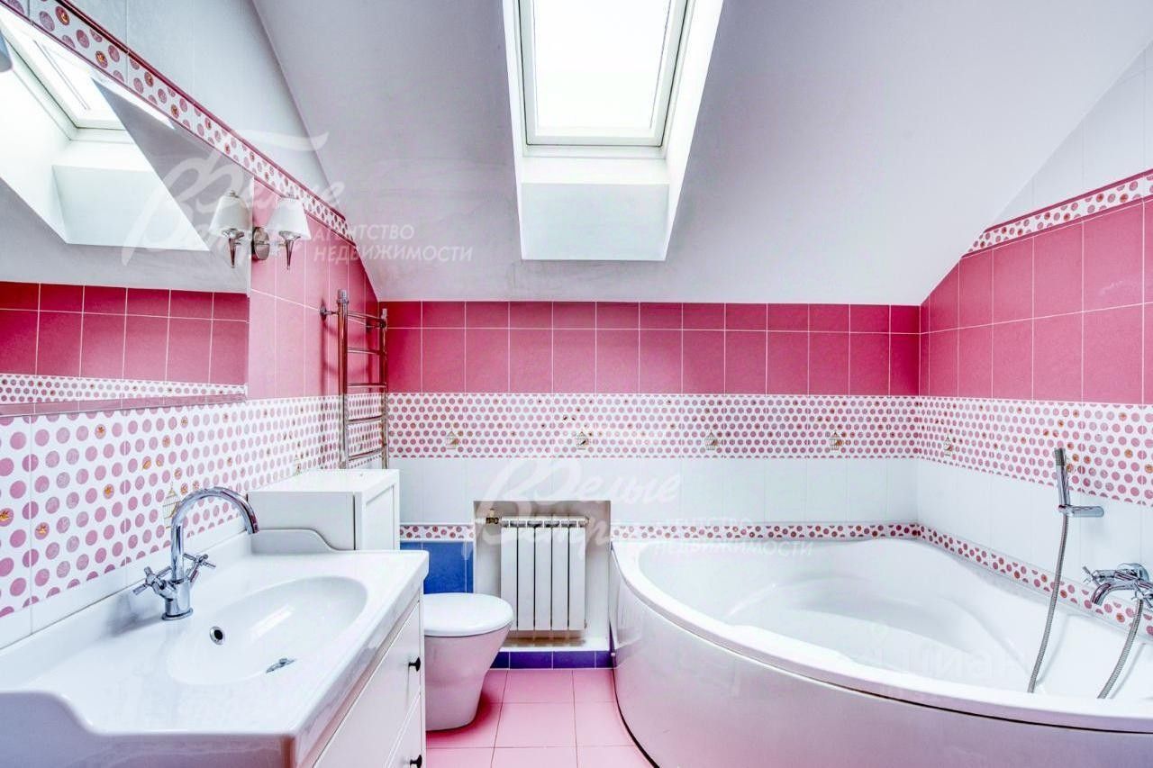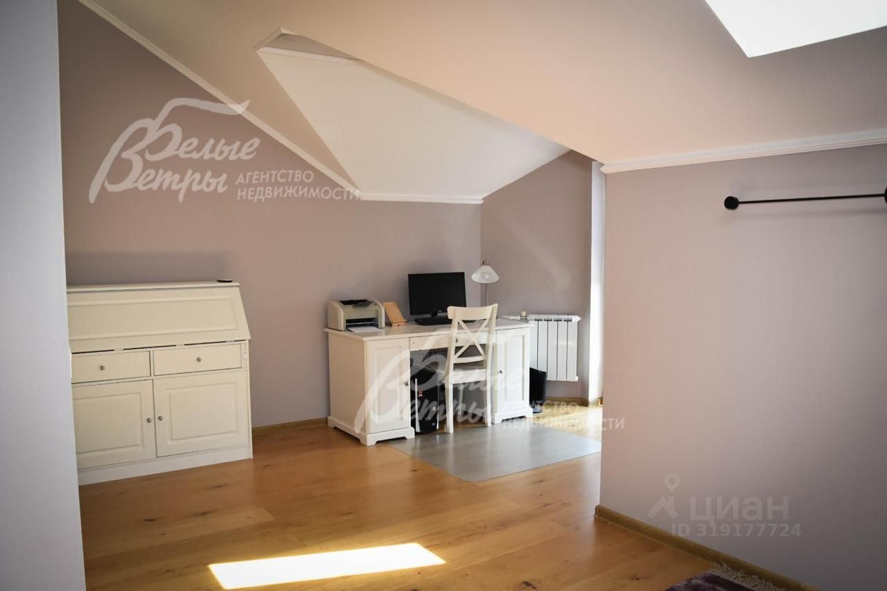 Описание внутренней отделки: отделка выполнена дорогостоящими импортными материалами в классическом стиле в светлых тонах. На стенах в гостиной, на кухне, коридорах обои под покраску, в спальнях обои, в том числе панно из обоев, в санузлах коллекционная плитка. На полу инженерная (паркетная) доска из дуба, ламинат, керамогранит с водяным подогревом на 1-м этаже и в санузлах 2-го и мансардного этажа. Разноуровневые потолки из гипсокартона с подсветкой и панелями. Установлены филёнчатые дубовые межкомнатные двери, подоконники ПВХ. На второй этаж ведёт монолитная лестница со ступенями, обшитыми износостойкой породой дерева дубом.