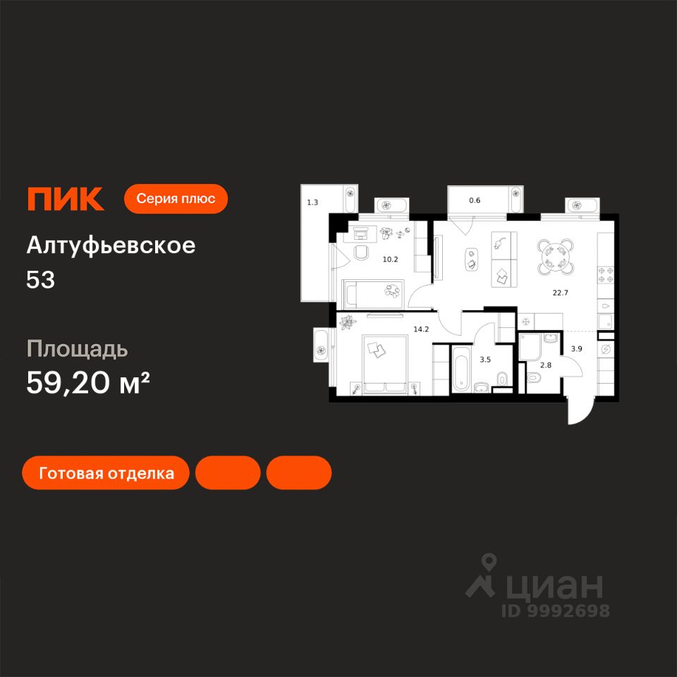 Продаётся 2-комн. квартира площадью 59,2 кв.м на 3 этаже 9 этажного дома (Корпус 1.1, Секция 3) проекта ПИК Алтуфьевское 53. Светлый просторный подъезд на уровне земли, функциональная планировка, большие окна, c отделкой.